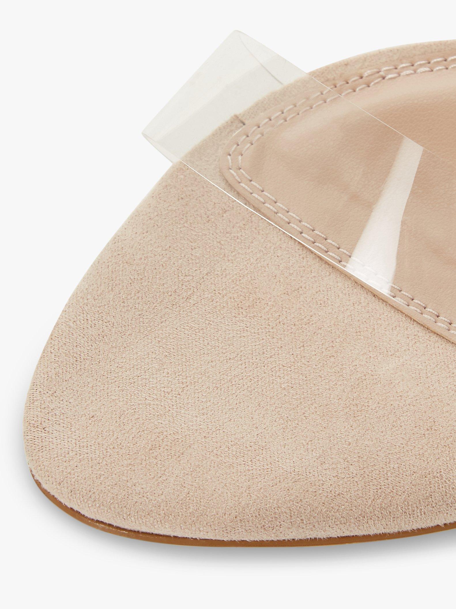 In a simple yet effective strappy silhouette, they feature a sleek stiletto heel and are secured with a transparent strap for modern appeal