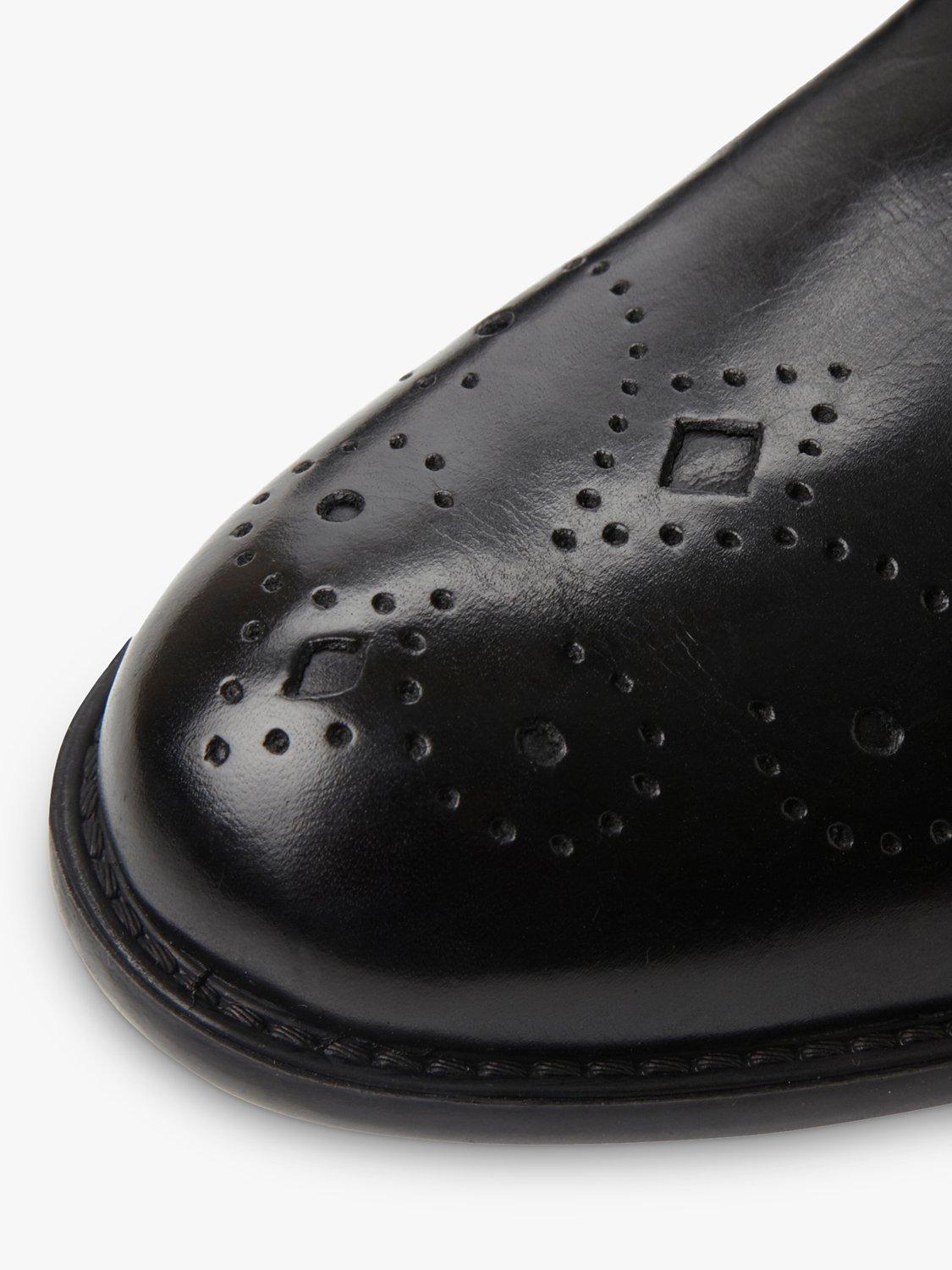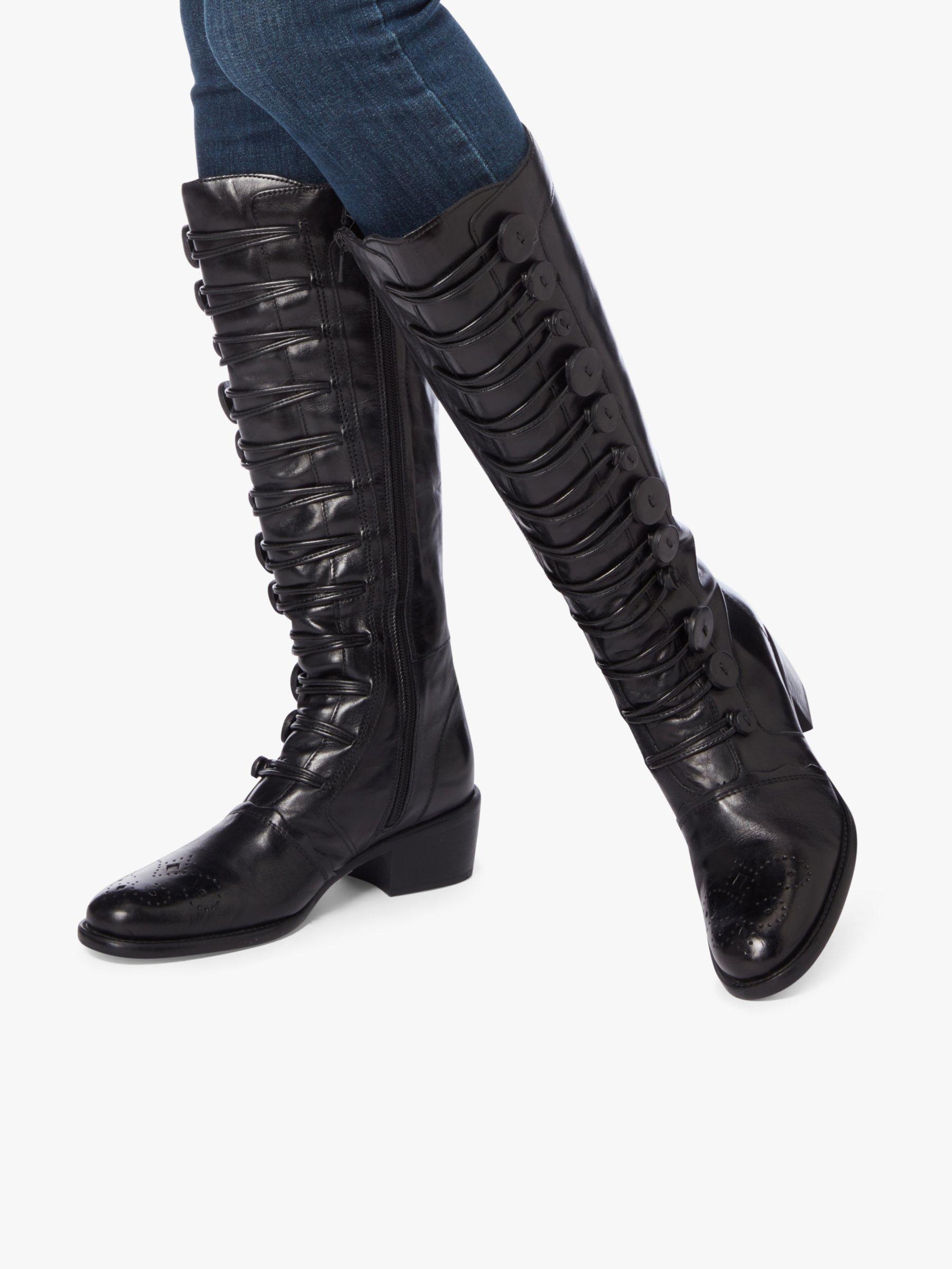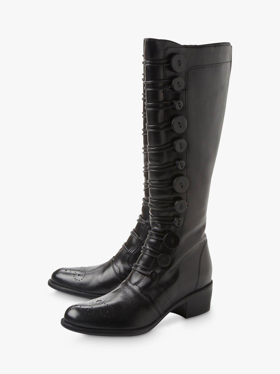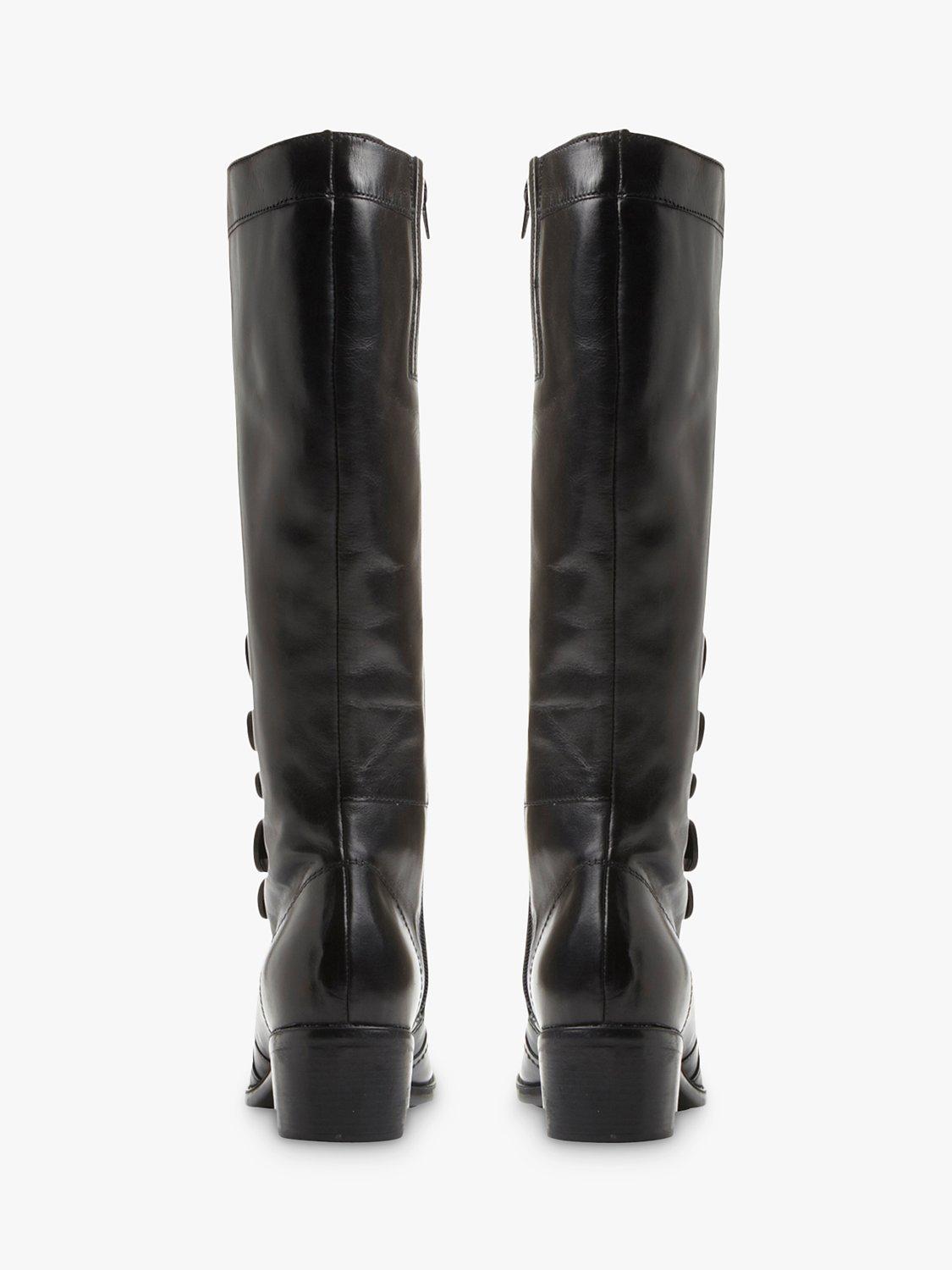 This knee high boot from Dune features a burnished toe with brogue detailing and an inside zip fastening. Button detailing to the front of the shoe adds a unique finish to a classic shoe shape.