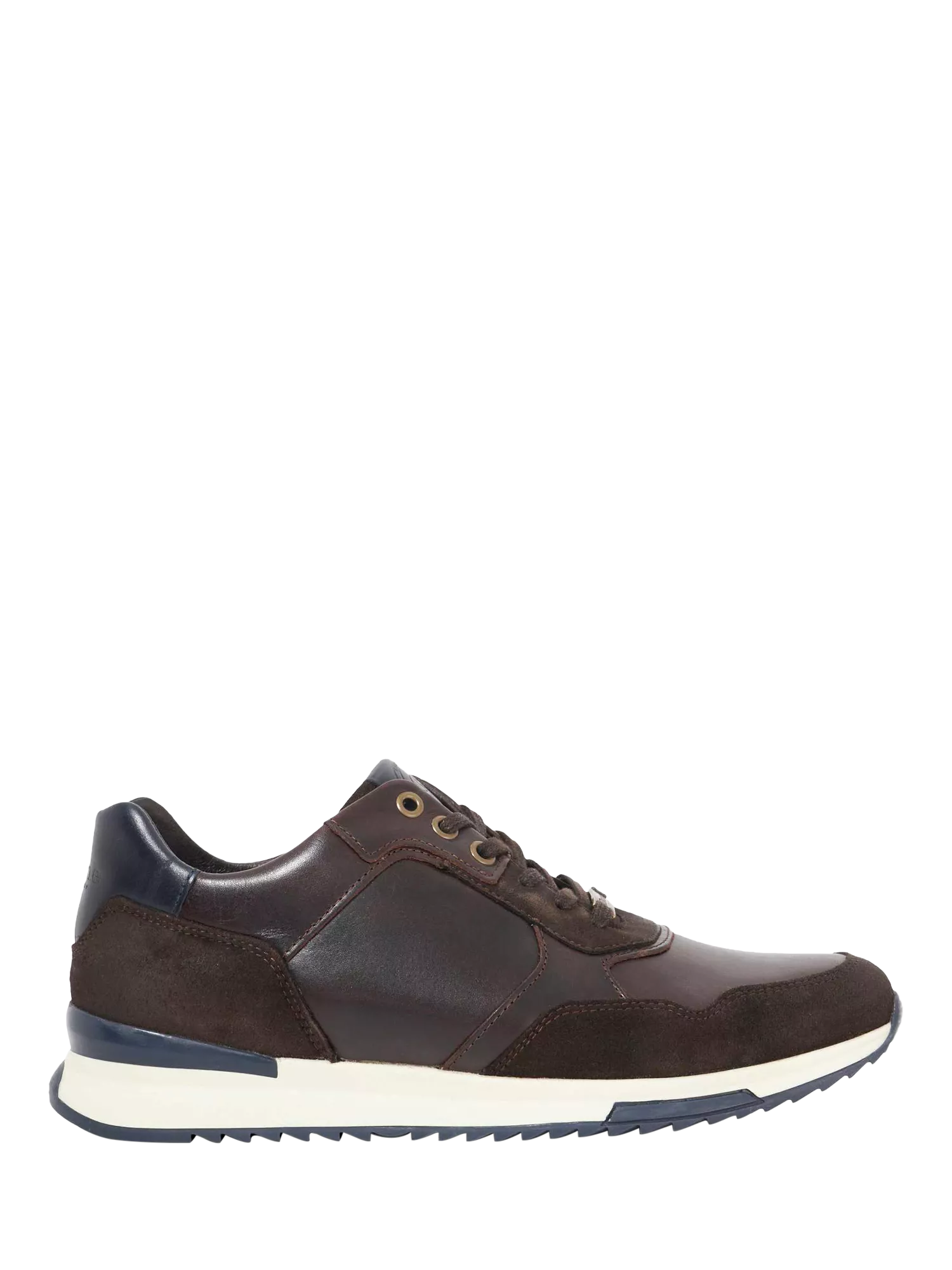 A smart and sporty leather trainer with coloured accent details, Thornberry from Dune features leather material with contrasting stitch detailing, laces and rubber sole. Complete your casual look with jeans and a zip-up knitted jumper.