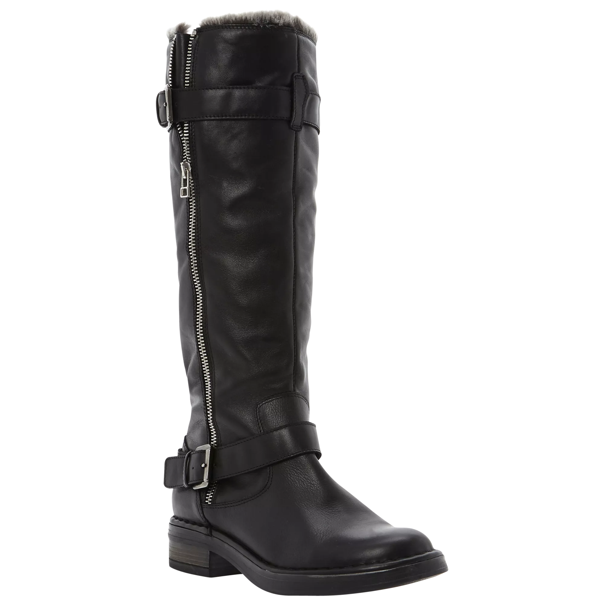 This Tooding knee high biker-style boot from Dune has an irresistible cosy touch. With faux fur lining, exposed zip, side adjustable detail and round toe. The thick buckled top and bottom straps add to its rugged appeal.