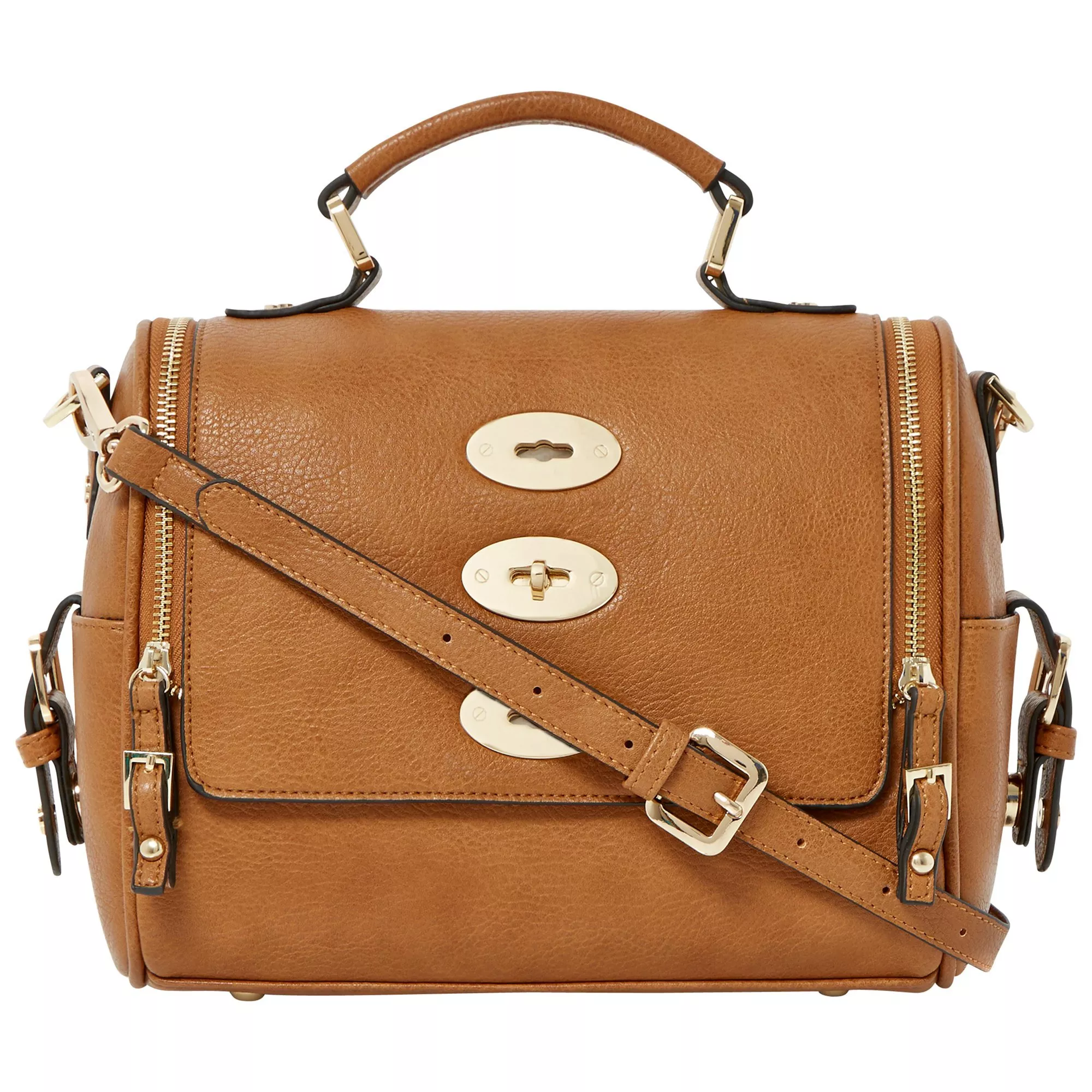 Boasting three statement gold lock fastenings on the front, the boxy shape is accented with strap and buckle detailing for added chic appeal. Finished with foot studs and double zip fastening to secure your contents.