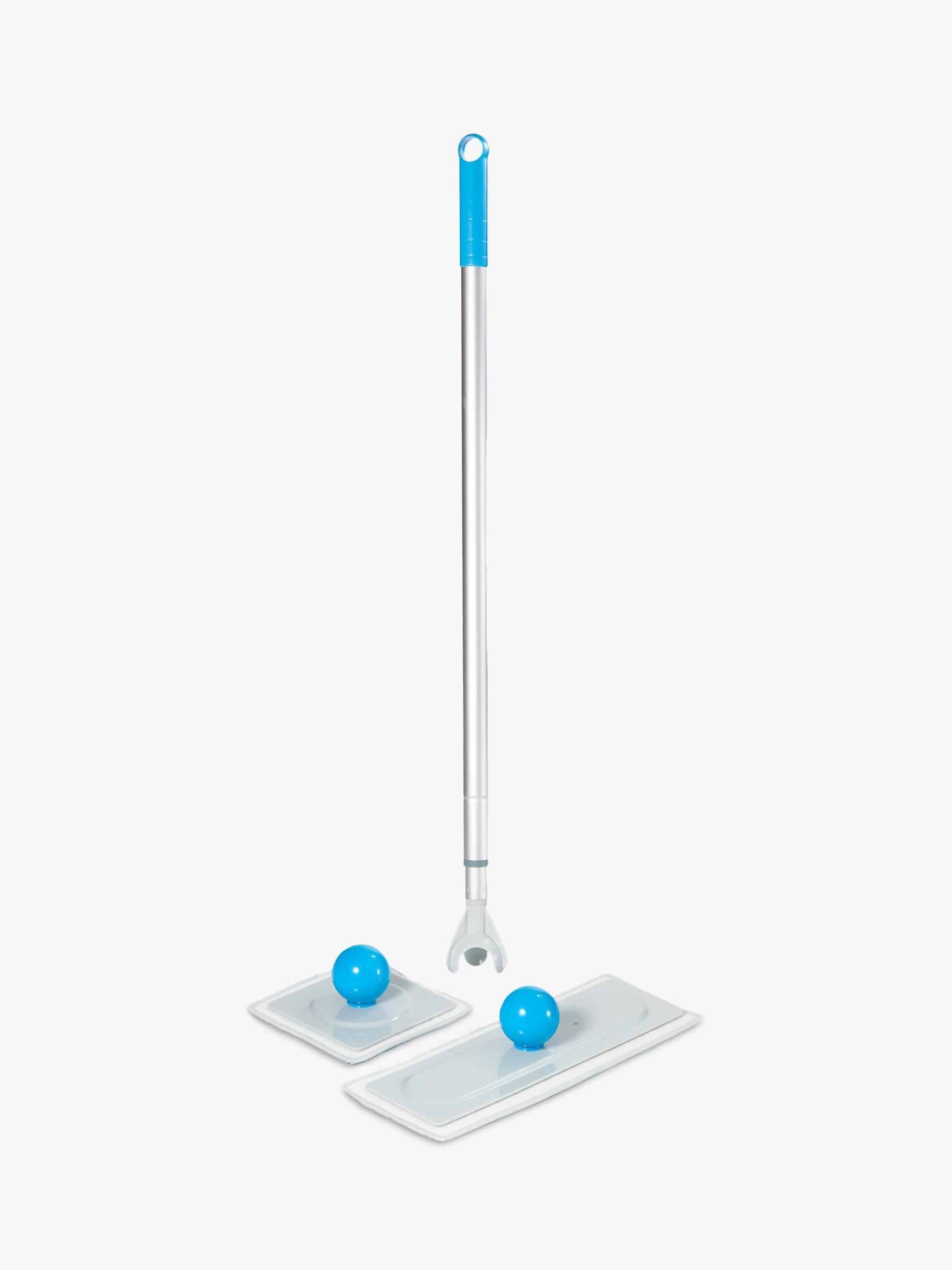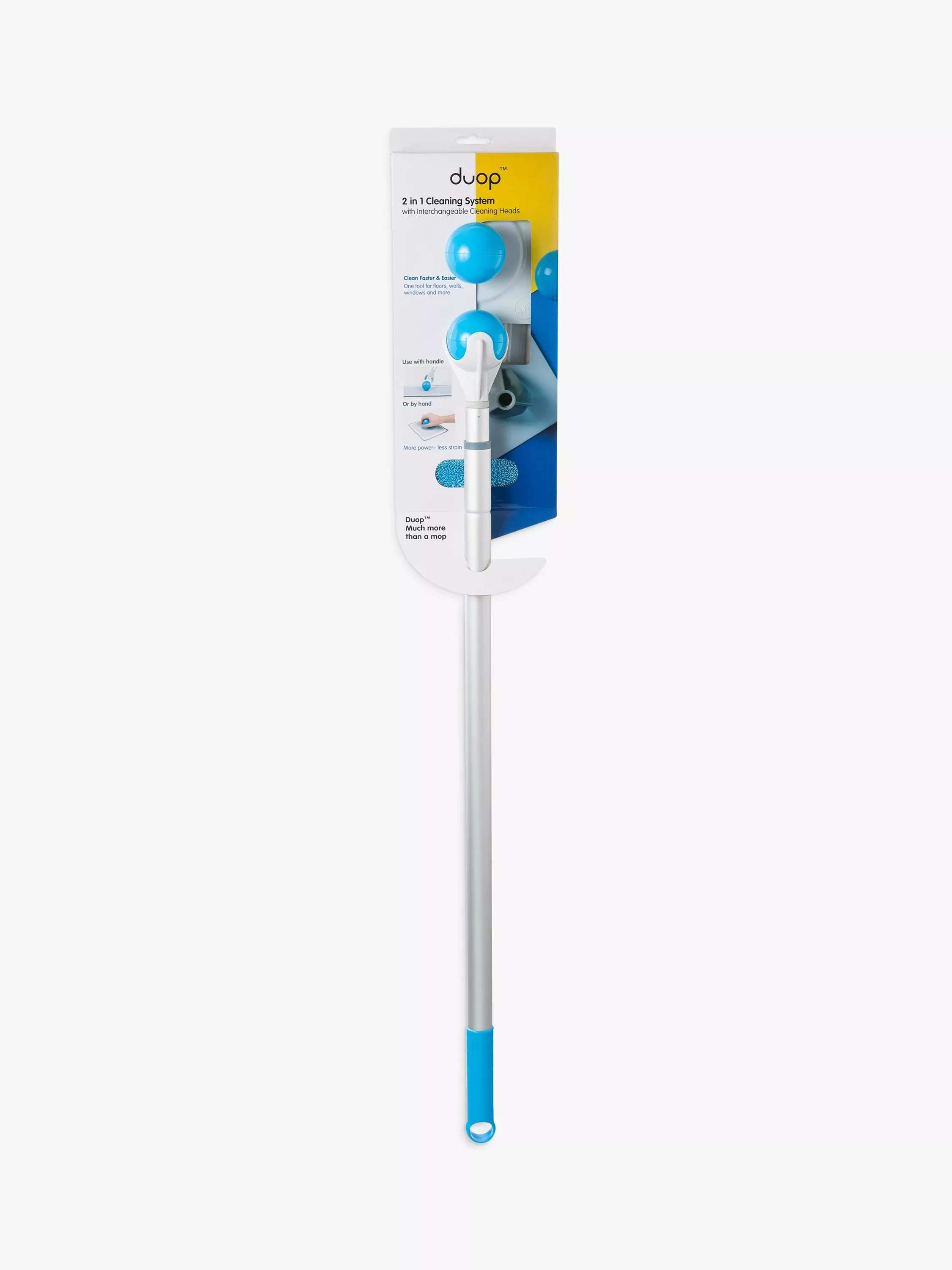 The Duop combination pack consists of a telescopic handle and 2 removable cleaning heads - 1x large for floors and 1x small for windows, walls, and confined spaces.
