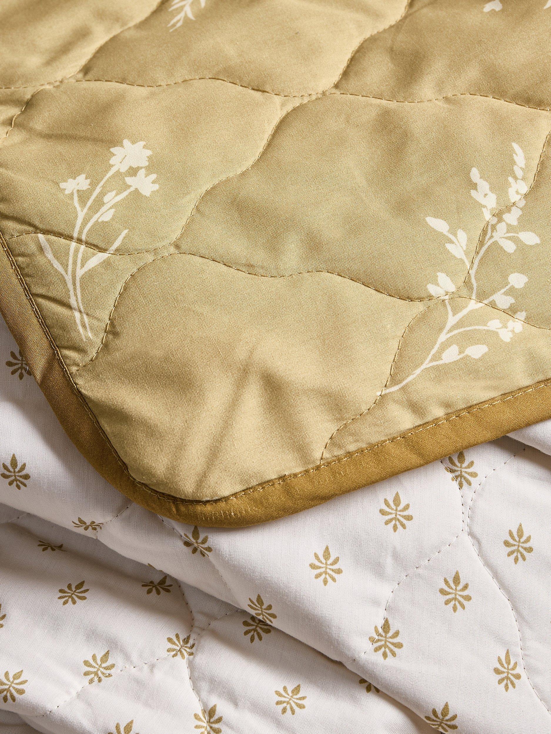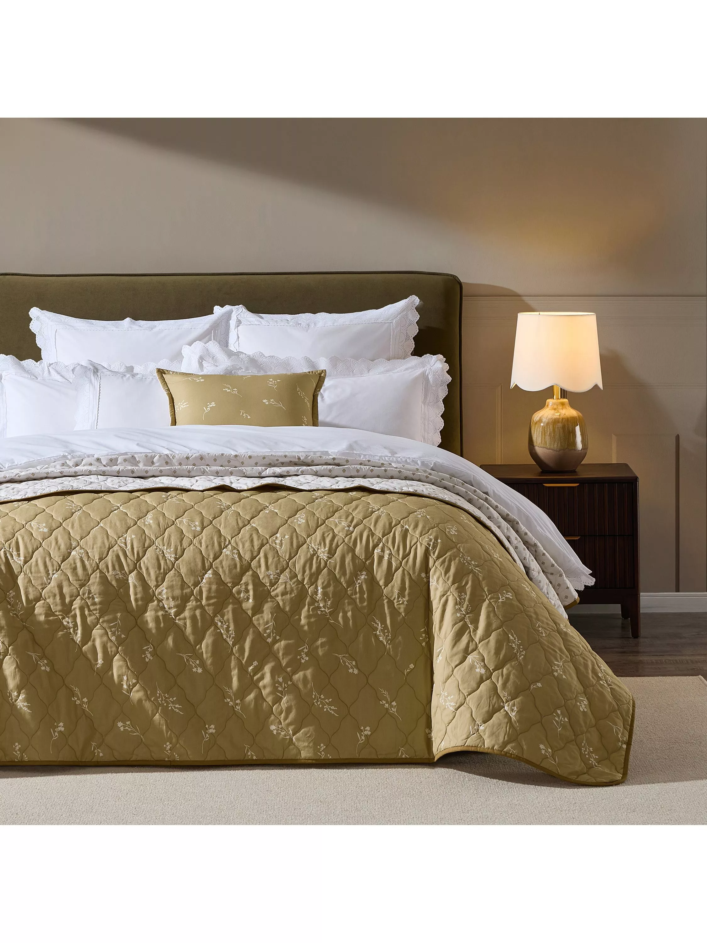 The warm olive tones add a cosy, nature-inspired feel, while the soft quilted texture brings extra warmth and comfort. A timeless layering piece for any bedroom.