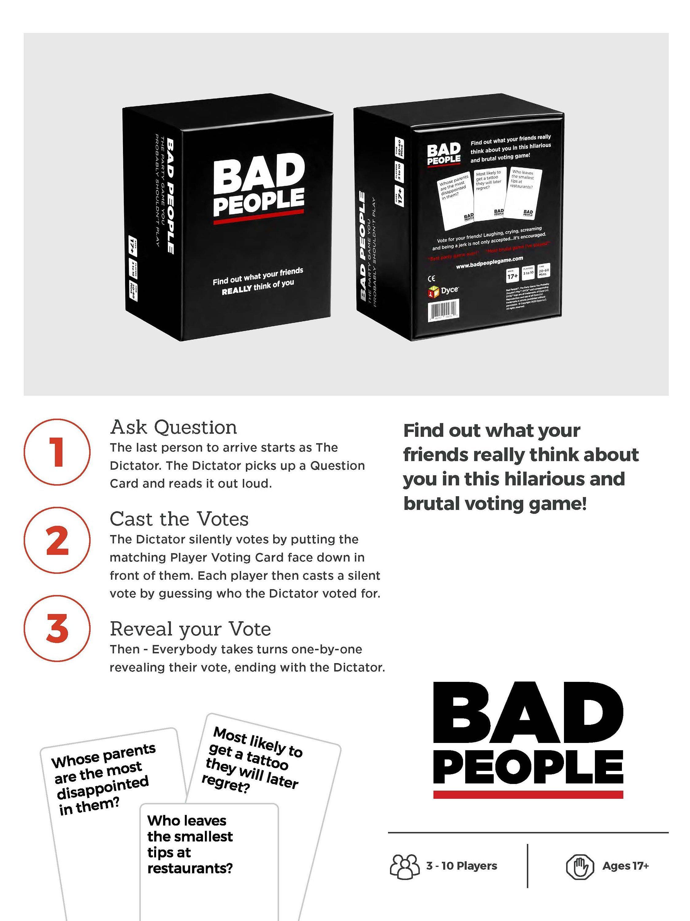 For example: "Whose funeral will have the smallest attendance?", "If we were all hitchhikers, who would be the last person to get picked up?", "Who has done the most ‘walks of shame?", "Least likely to be a target for identity theft?" Plus so many next level naughty questions that we cant even write in the description.