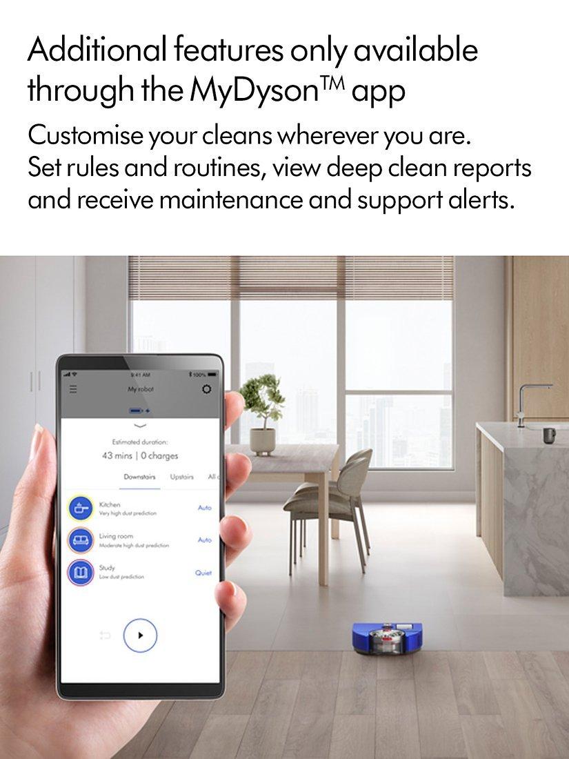 The Dyson 360 Vis Nav™ works in tandem with the MyDyson™ app, allowing it to analyse, map and create zones for every room and floor of your home. You can then choose how and when your robot cleans them. Connecting to the MyDyson™ app also unlocks all the robot’s intelligent features: customising cleans remotely wherever you are, smart scheduling, setting rules and routines, choosing cleaning modes for each room, setting areas or rooms to avoid, receiving clean time estimates, viewing deep clean reports and dust estimates and receiving maintenance and support alerts.