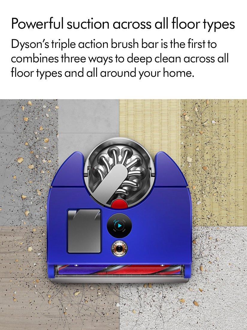 A new triple action brush bar cleans right to the edge and is the first to combine three ways to deep clean across all floor types and all around your home. Black anti-static carbo fibre filaments remove fine dust from hard floors. Stiff-nylon bristles dig deep into carpets to remove ground in debris. Soft woven nylon captures large debris on hard floors. And with a large bin and extra wide brush bar, the Dyson 360 Vis Nav™ can clean for longer and pick up more with each pass.