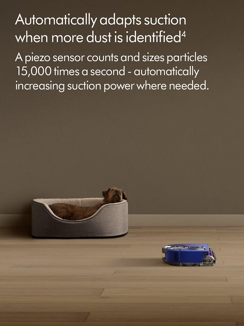 In Auto mode, a piezo sensor inside the Dyson 360 Vis Nav™ monitors dust levels over 15,000 times a second to detect microscopic particles that are invisible to the eye, automatically increasing suction power when higher dust volumes are identified.⁴