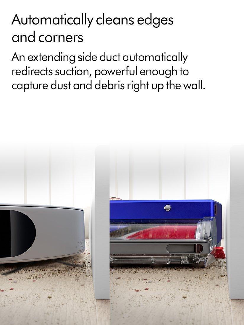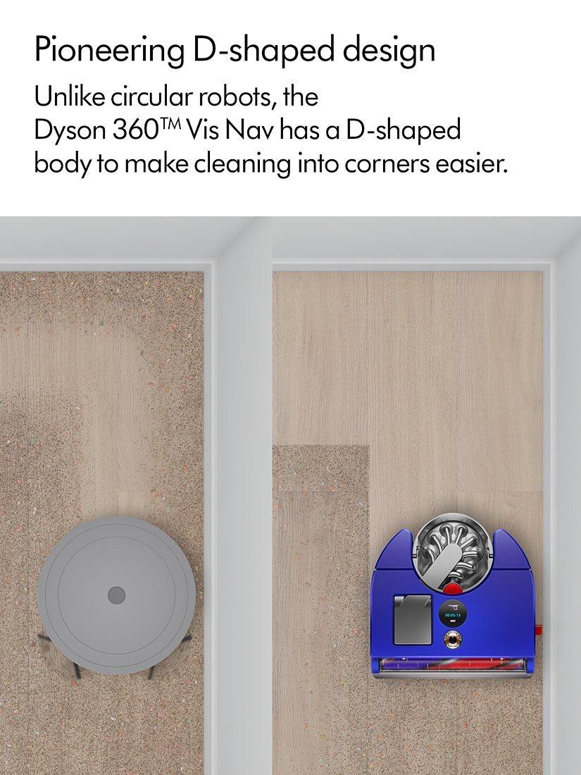 A pioneering D-shaped makes cleaning into corners easier and more effective, unlike circular robots. The triple-action brush bar is also positioned at the front of the robot, rather than in the middle, so it is easier to navigate into corners. And unlike side sweepers that flick dirt away, the Dyson 360 Vis Nav™ has a new extending side duct which redirects suction, powerful enough to capture dust and debris right up to the wall.