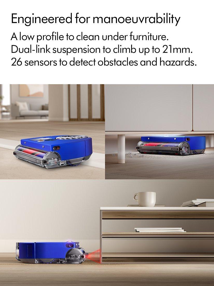A low profile allows the robot to clean all the way under low furniture to regularly clean the dirtiest places you can’t reach, while an LED light ring helps it navigate in low light and corners. Advanced dual-link suspension maintains traction, allowing the robot to climb steps up to 21mm so it gets where it needs to clean. And a balanced centre of gravity allows for mobility and traction.