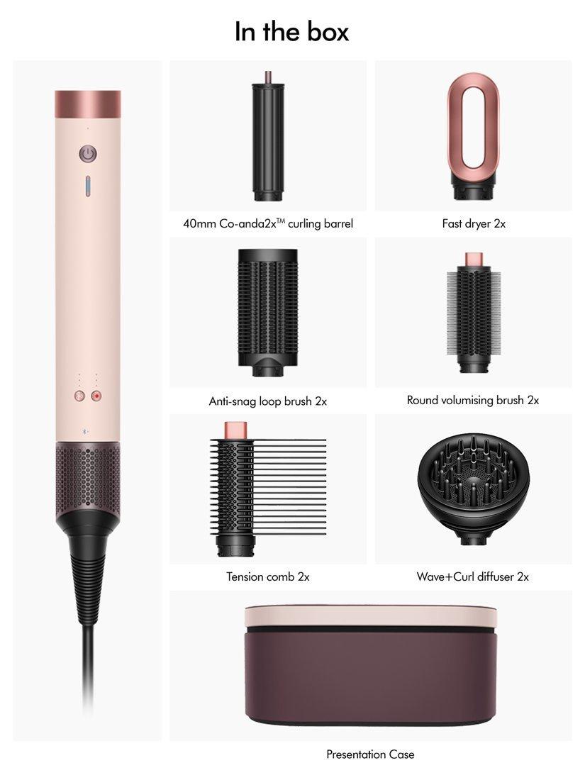 - New Dyson Airwrap Co-anda2x™ multi-styler and dryer - Curly+Coily (Ceramic pink/Rose gold) 40mm Co-anda2x™ curling barrel Anti-snag loop brush 2x Round volumising brush 2x Tension comb 2x Wave+Curl diffuser 2x Fast dryer 2x Presentation case