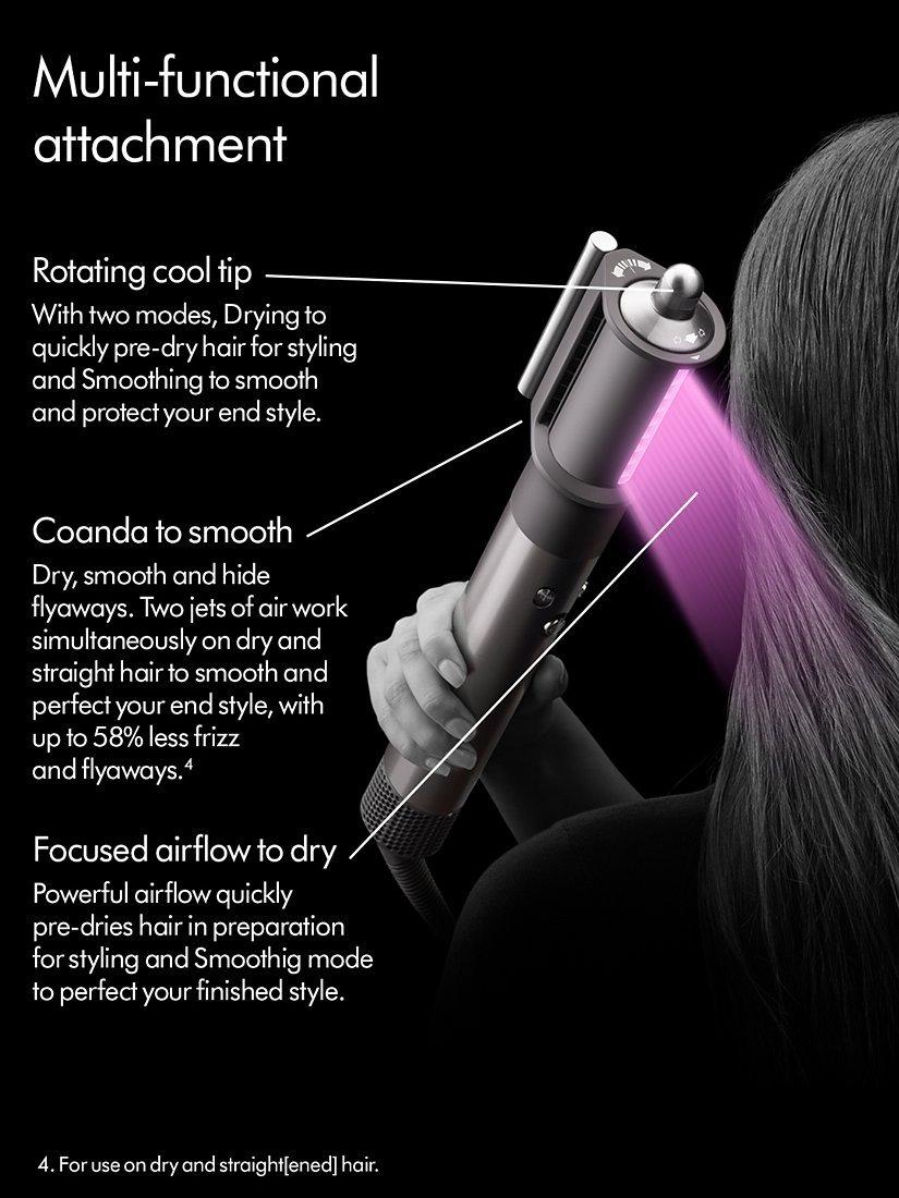 - 2-in-1 Coanda Smoothing Dryer -Versatile, multi-functional attachment to dry, smooth and hide flyaways. Dryer mode for fast drying to pre-dry your hair from wet before styling with your chosen attachment. Focussed airflow allows you to create volume at the roots. Flyaway mode is the ideal finishing tool to smooth and perfect your end style. Two jets of air work simultaneously on dry and straight[ened] hair to hide flyaways under longer hair. For up to 58% less frizz and flyaways⁵.