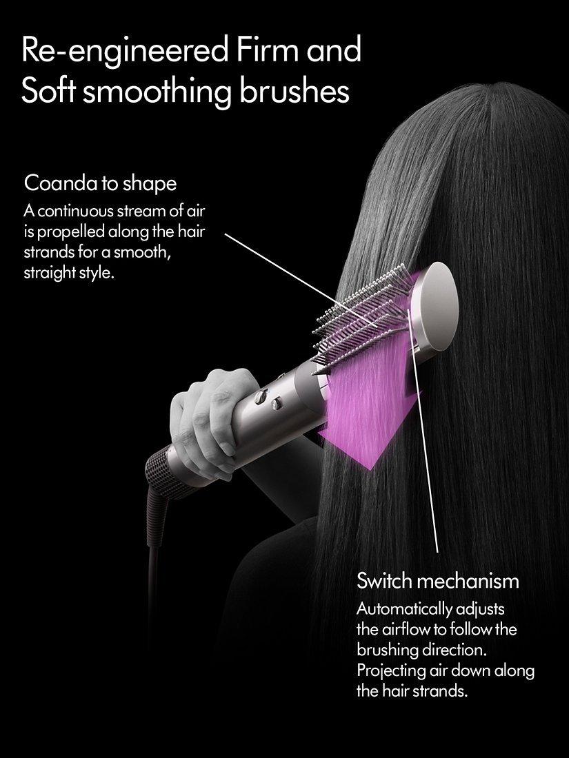 - Smoothing Brushes - Shape and dry hair with increased control³ using Enhanced Coanda airflow. Softer bristles are engineered for finer hair, and firmer bristles for thicker hair. Brush under the hair for volume and brush on top of the hair for smoother, straighter styles.
