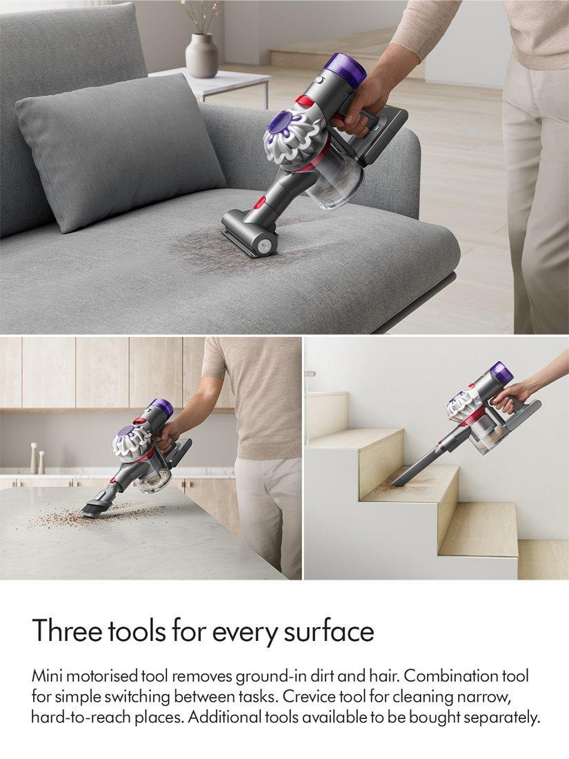 Three tools for whole home deep cleaning. Mini motorised tool removes ground-in dirt and hair. Combination tool for simple switching between tasks. Crevice tool for cleaning narrow, hard-to-reach places.