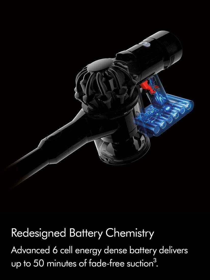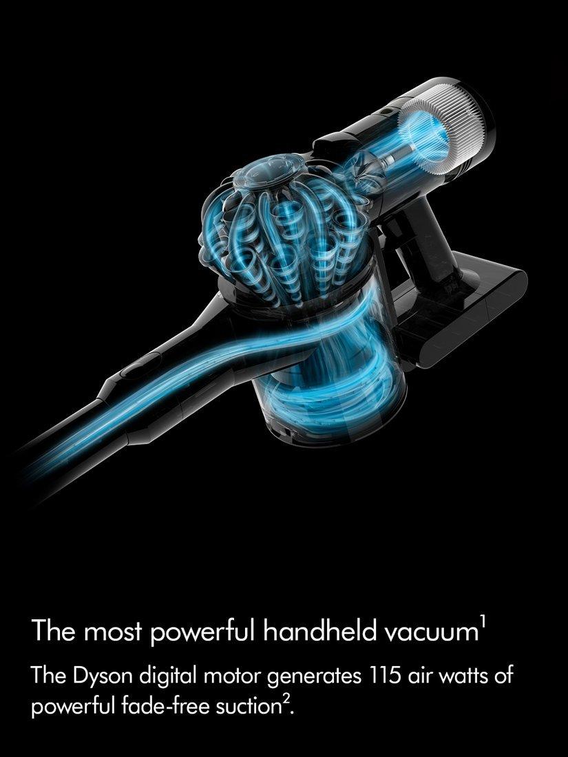 The Dyson digital motor generates 115 air watts of powerful fade-free suction2 with up to 50 minutes run time to deep clean all around your home3. Root Cyclone technology captures dust and debris from the airflow with no loss of suction. Maintaining maximum suction power.