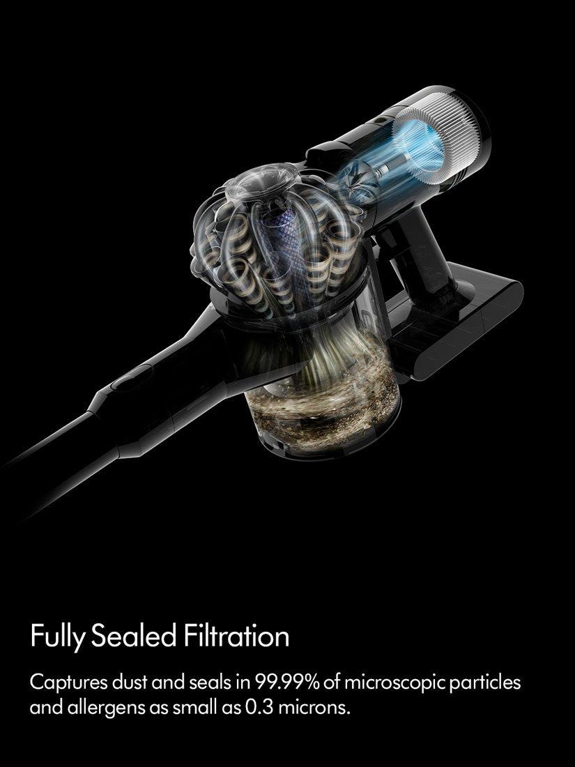 Whole-machine advanced filtration. Dyson's fully sealed filtration system captures dust and seals in 99.99% of microscopic particles and allergens - expelling cleaner air into your home (filtration tested to ASTM F1977 in Max mode).