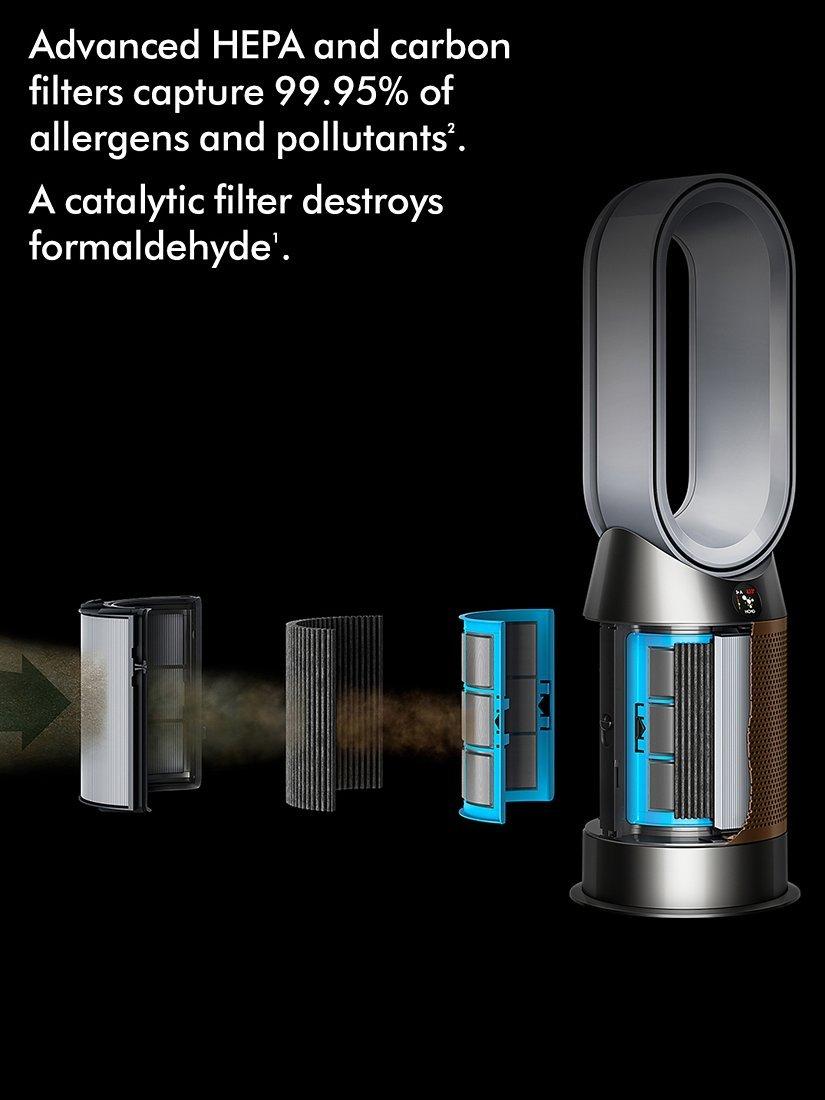 Dyson Purifier Hot+Cool™ Formaldehyde HP09 purifying fan heater. Captures dust, allergens and bacteria. Even destroys formaldehyde.1 Fully-sealed to HEPA standard – what goes inside, stays inside.