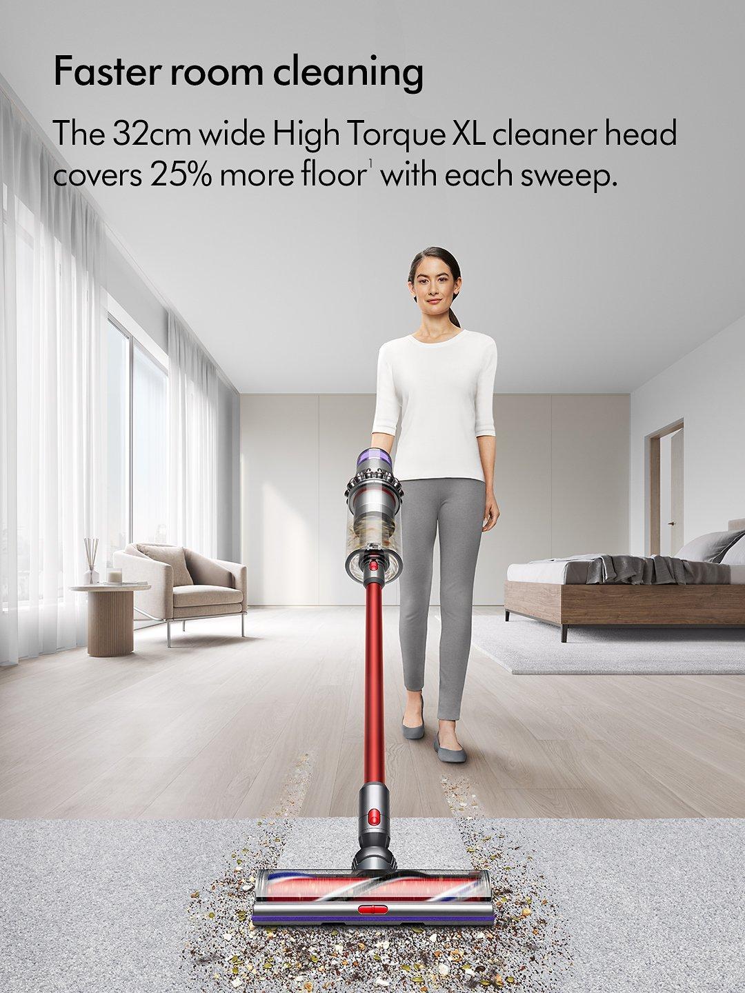 The 32cm wide High Torque XL cleaner head covers 25% more floor with each sweep than the standard Dyson V15™ vacuum, for faster room cleaning.