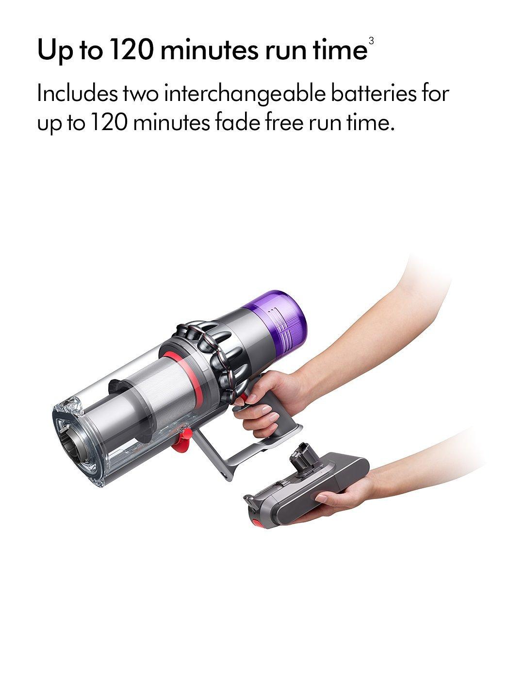***Run time will vary based on power mode, floor type and/or attachments used. 120 minutes run time is based on consecutive use of two separate battery packs.