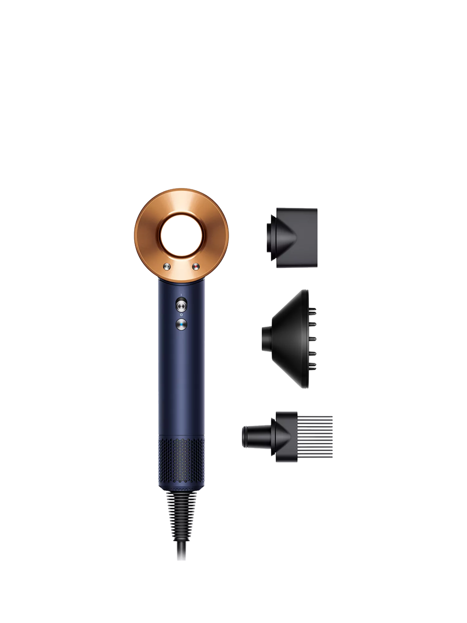 - Dyson Supersonic™ hair dryer; wide-tooth comb attachment; diffuser; styling concentrator