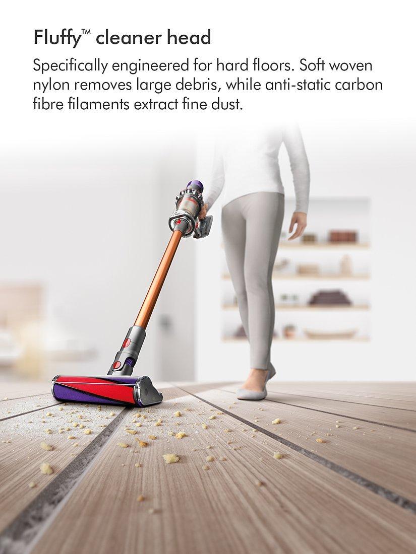 Fluffy™ cleaner head engineered for hard floors. Soft woven nylon removes large debris, while anti-static carbon fibre filaments extract fine dust.