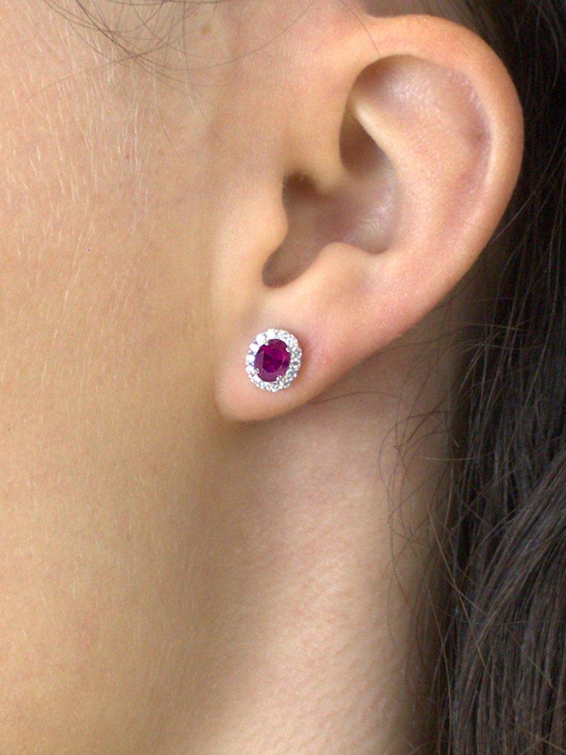 Simple yet stunning, these stud earrings feature an oval ruby with a surround of 28 round brilliant cut diamonds all claw set in 18ct white gold. The earrings are secured with post and butterfly fittings that re for pierced ears only.