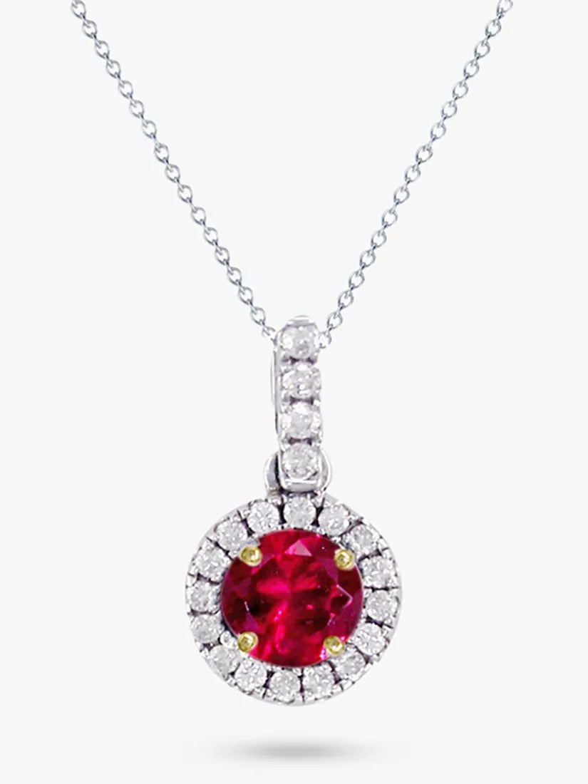 Crafted from 18 carat solid white gold, the necklace boasts a small round pendant. The pendant presents a faceted round-cut ruby surrounded by 20 brilliant-cut diamonds.