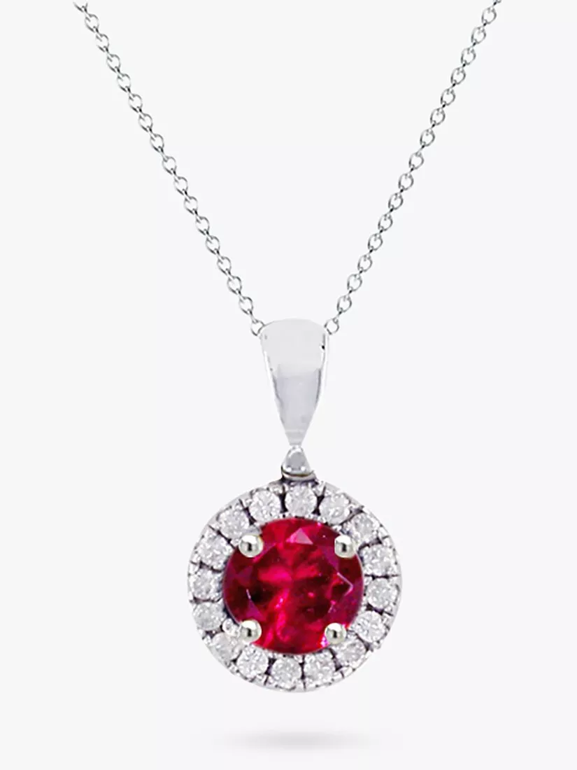 A stunning round cluster design, this 18ct white gold pendant necklace features 16 round brilliant cut diamonds surrounding a central vibrant ruby. The pendant hangs from a bail on a fine chain that's adjustable in length for the perfect fit.
