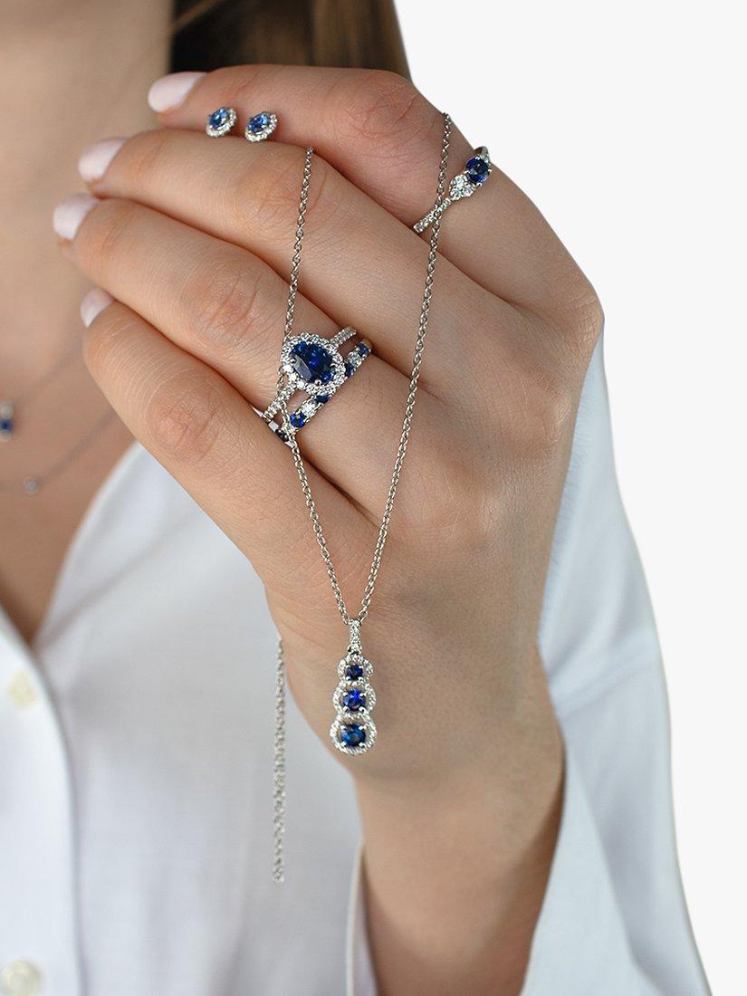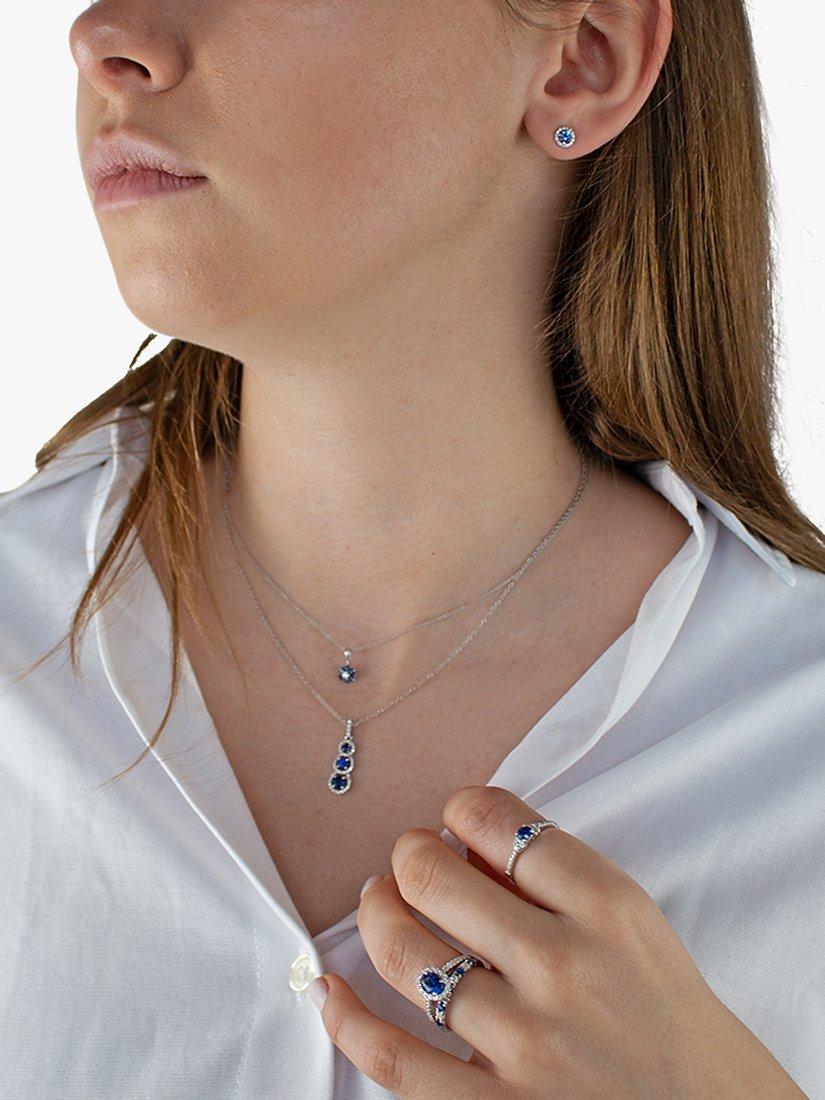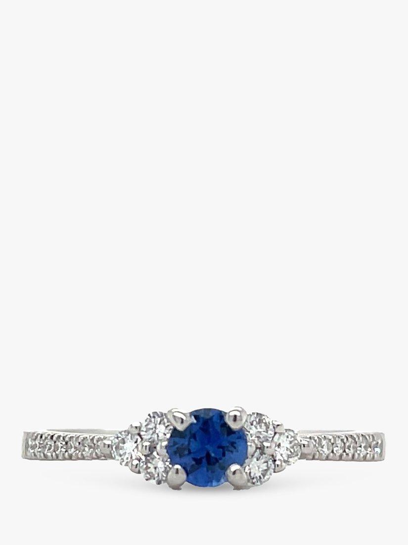 Beautifully designed, this ring features a round, vibrant sapphire surrounded by diamond set shoulders. A true luxury piece it boasts a total of 22 round brilliant-cut diamonds set in 18ct white gold so as to enhance the colourlessness of the stones.