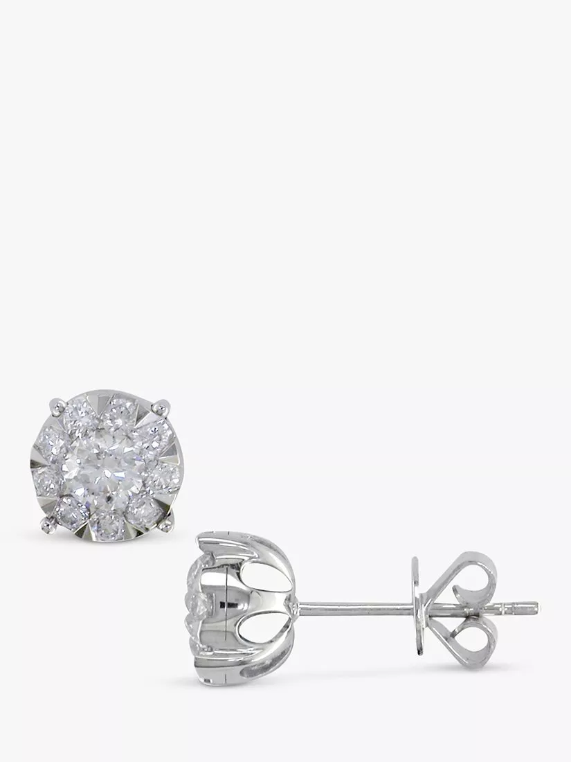 A glittering pair of stud earrings from EWA, which create the effect of solitaire studs with a cluster of round cut diamonds. On 18ct white gold fittings, with a 4-claw setting.