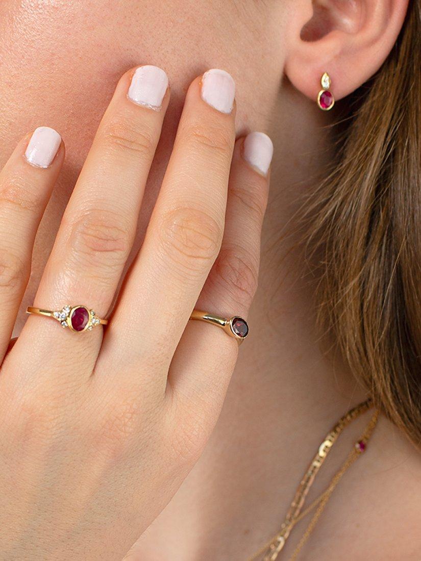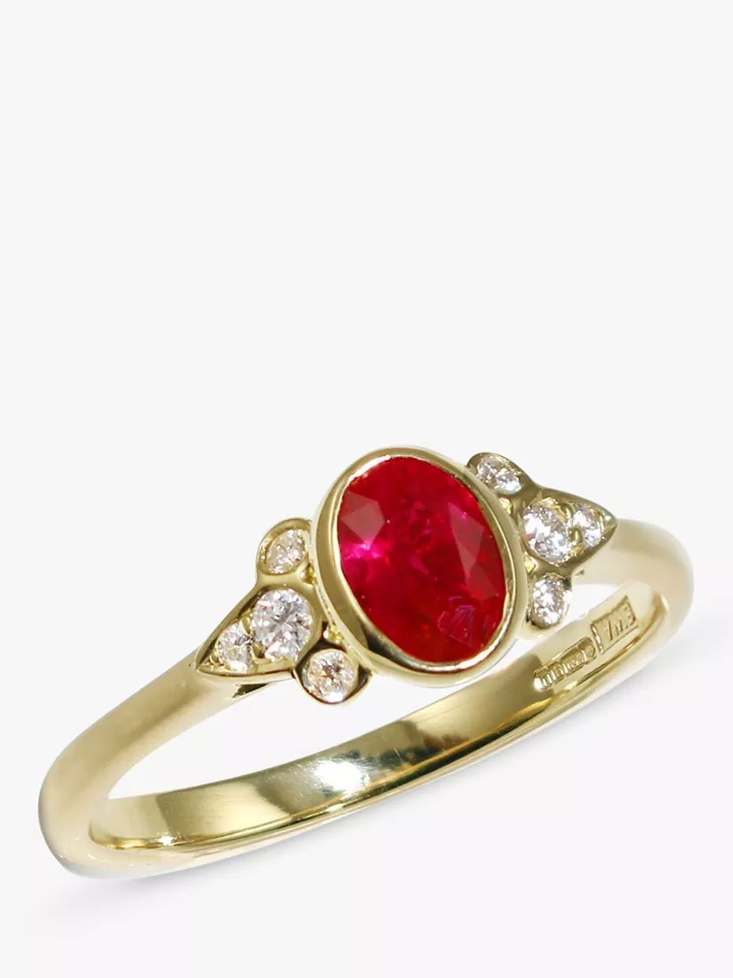 This ring from E.W.Adams is ideal for adding a touch of colour to your look thanks to the vibrant oval-cut ruby that takes centre stage in this design. The ruby is further accentuated by a cluster of diamonds on each shoulder, all set in 18ct yellow gold.
