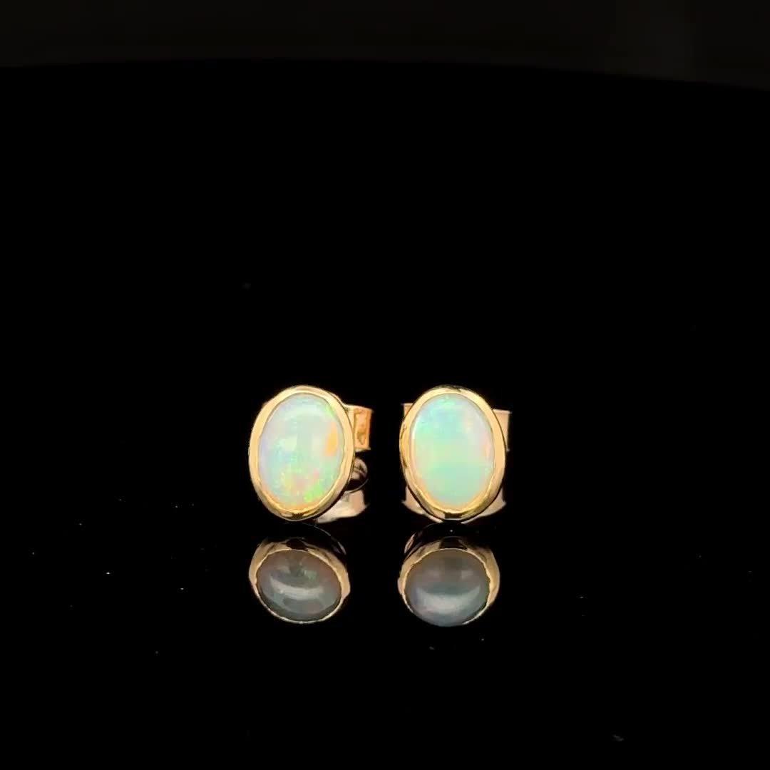 The earrings come in a solid gold frame with a polished oval semi-precious stone. The stone is presented in a rub-over setting. Finished with classic butterfly fittings that are for pierced ears only.