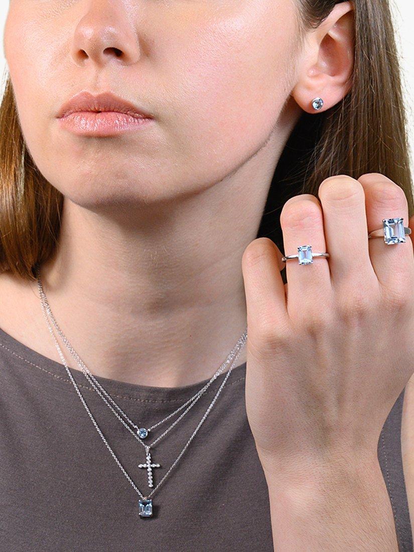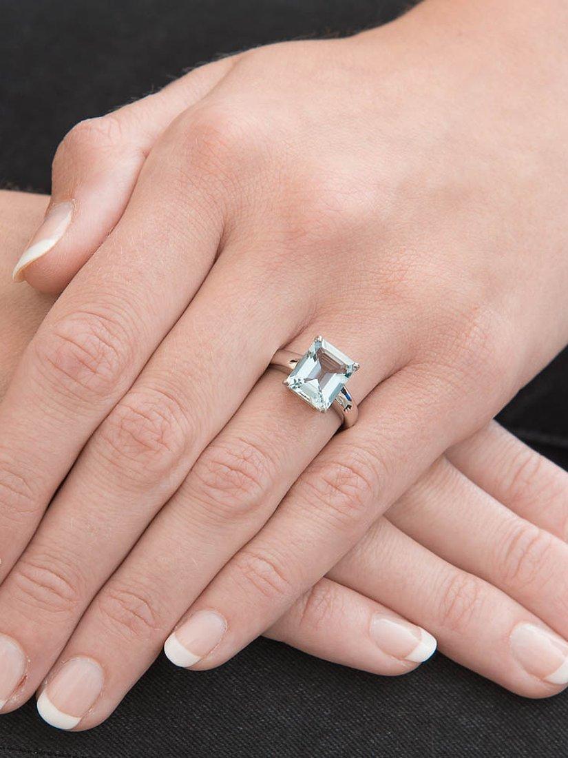 A stunning cocktail ring from EWA. The 9ct white gold band features a large, emerald cut aquamarine stone. Set lengthways along the finger, the W11 x H9mm stone is elegantly faceted to accentuate the rich colours of the aquamarine. Ring size: N.