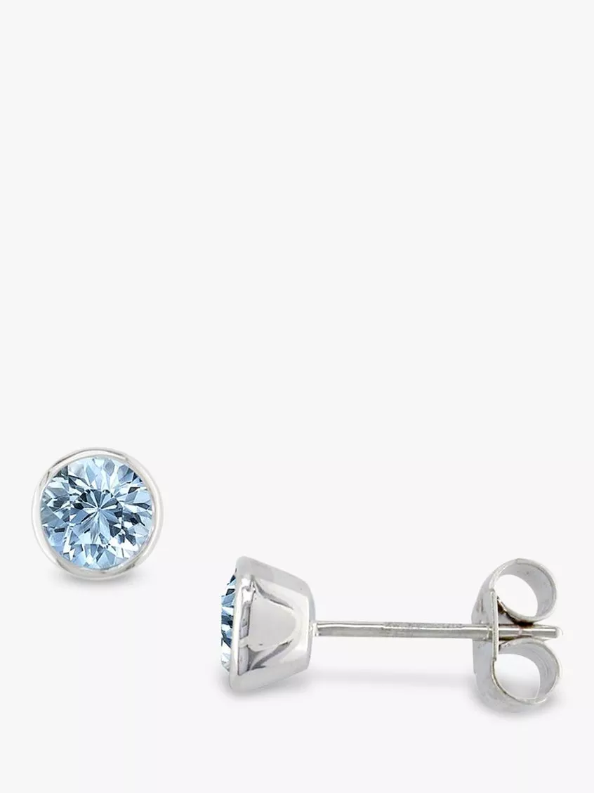 Abundantly beautiful these EWA stud earrings combine alluring 9ct white gold with a stunning round aquamarine stone. Features butterfly fitting and modern rubover setting.
