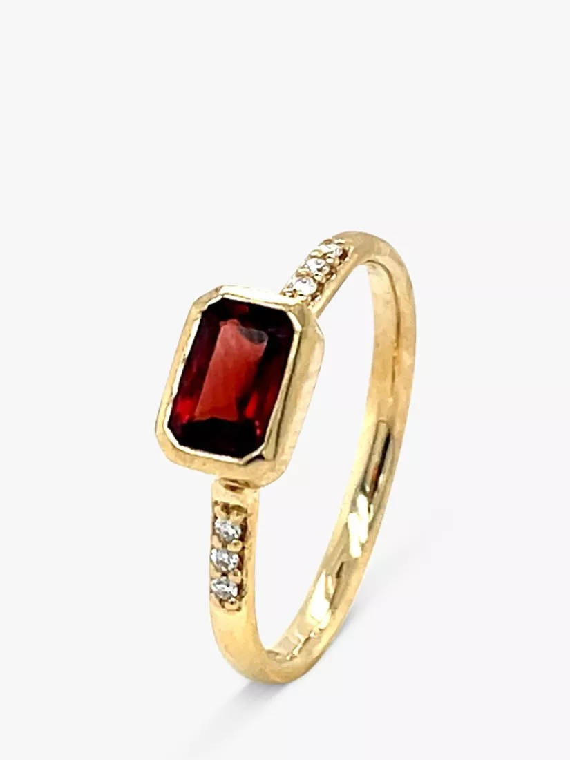 Invest in perennial jewellery with this E.W Adams cocktail ring. A vibrant garnet takes centre stage and is complemented with three round brilliant-cut diamond claw set on either shoulder. The combination of precious and semi-precious stones make this piece an easy-to-wear design that is ideal for various formal occasions.