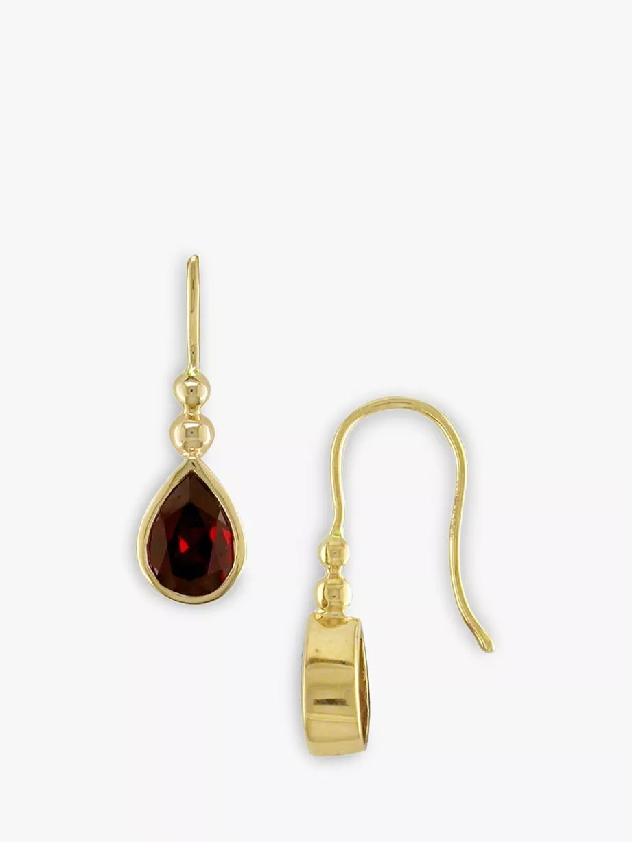 Pear shape, deep red garnets, measuring 7mm x 5mm, in 9 carat yellow gold rub over settings with yellow gold hook fittings.