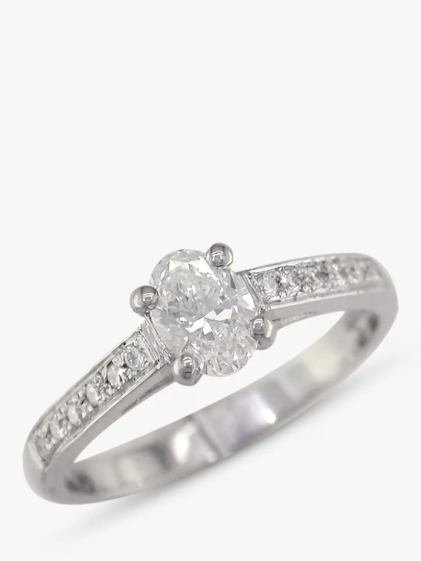 Made from solid platinum and encrusted with luxurious diamonds, this ring is beautiful to behold. The design is set with a central single oval diamond and accented with multiple smaller diamonds on the shoulders for an overall sparkling finish. A symbol of true love, purity, rarity and strength, platinum makes an excellent choice for that special someone.