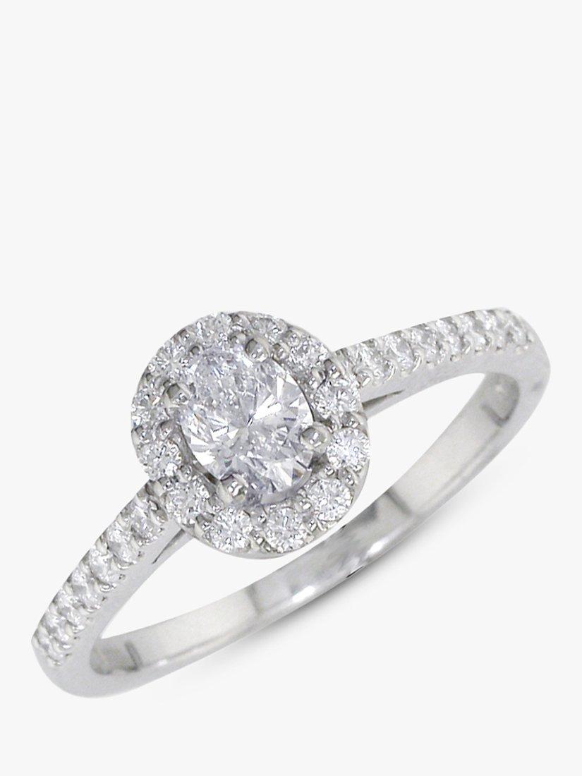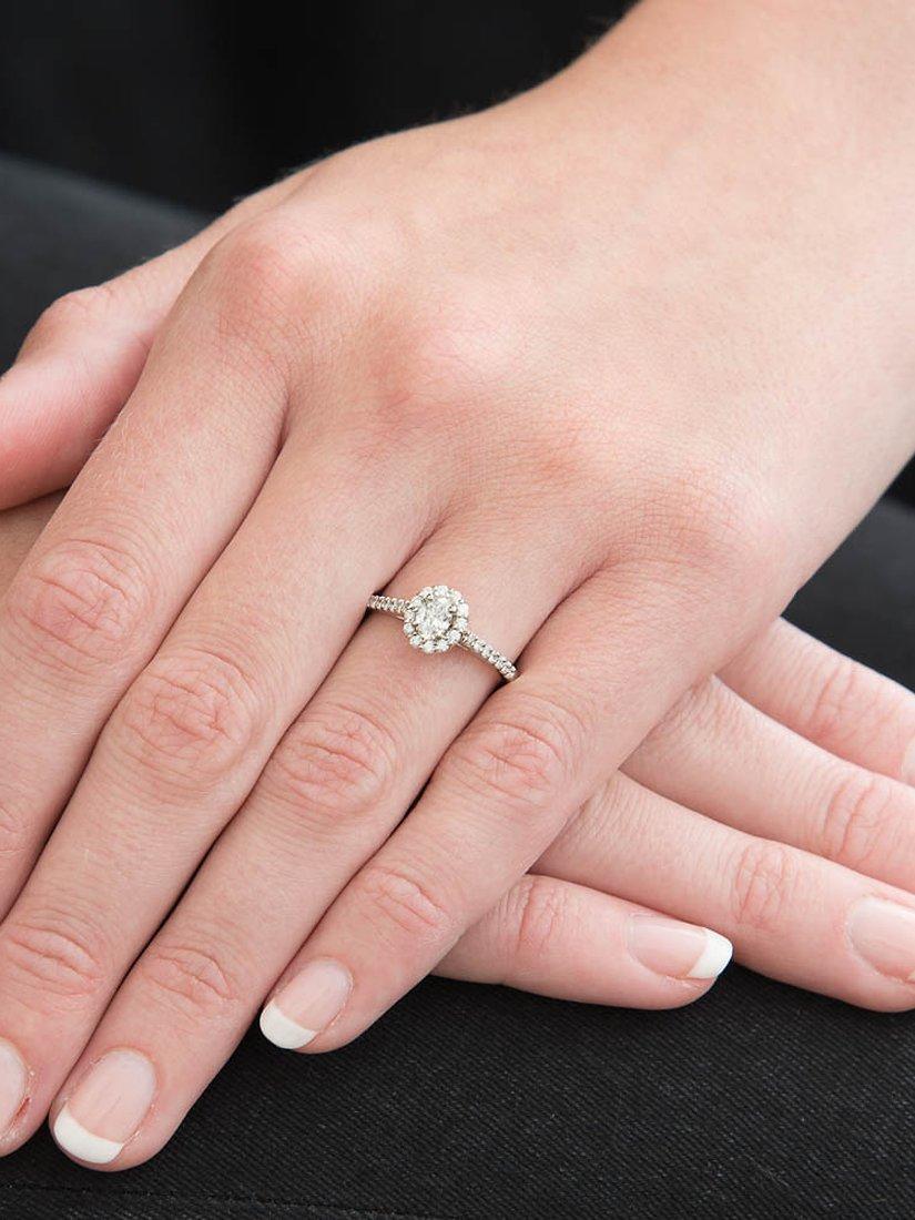 Embody timeless elegance with this platinum oval diamond cluster ring, showcasing a single oval diamond in the centre, with a total weight of 0.30cts. This stunning piece is surrounded by 12 claw-set diamonds, weighing 0.15cts, finished with 14 brilliant round diamonds on the shoulder, weighing 0.17cts.