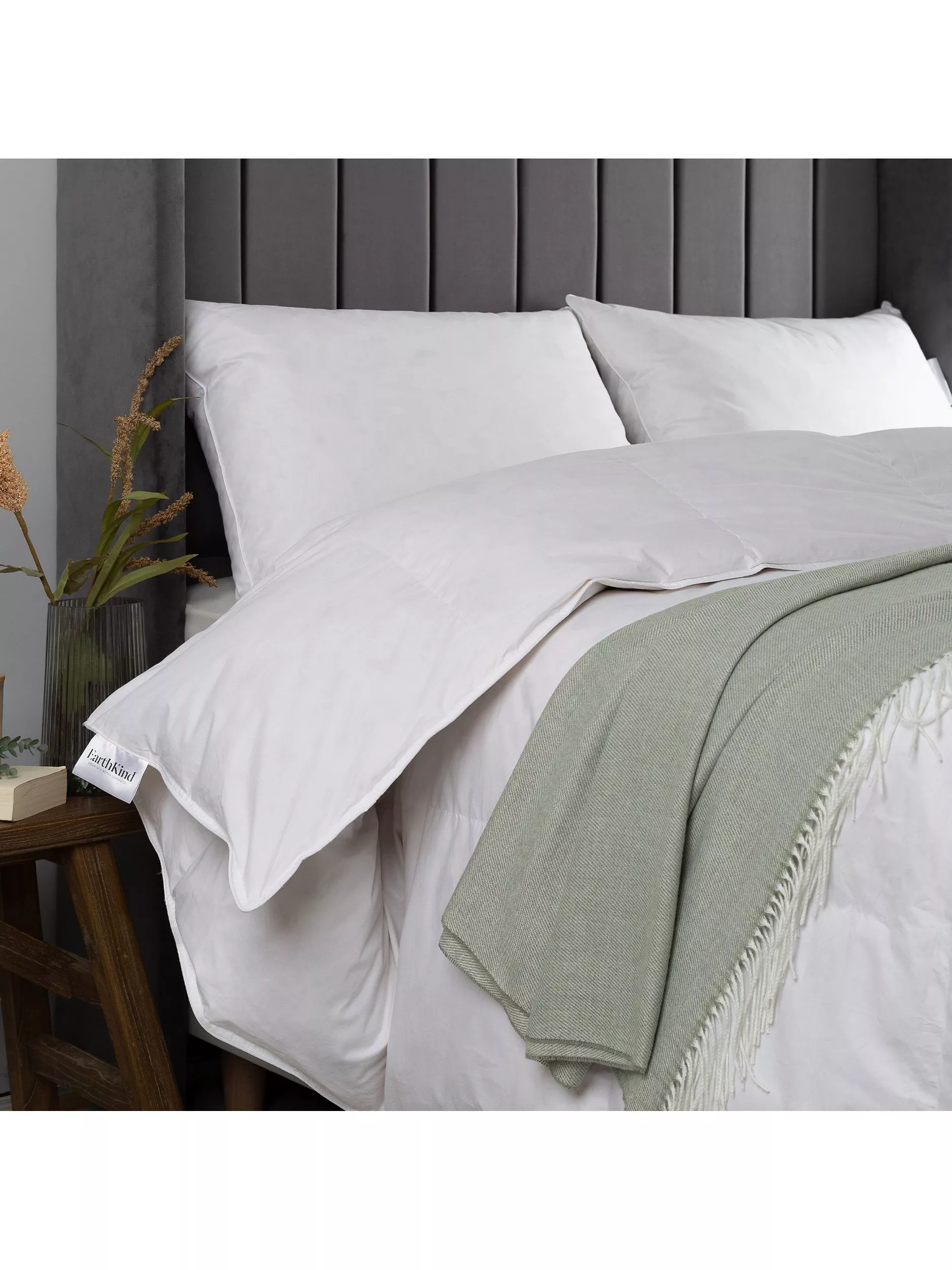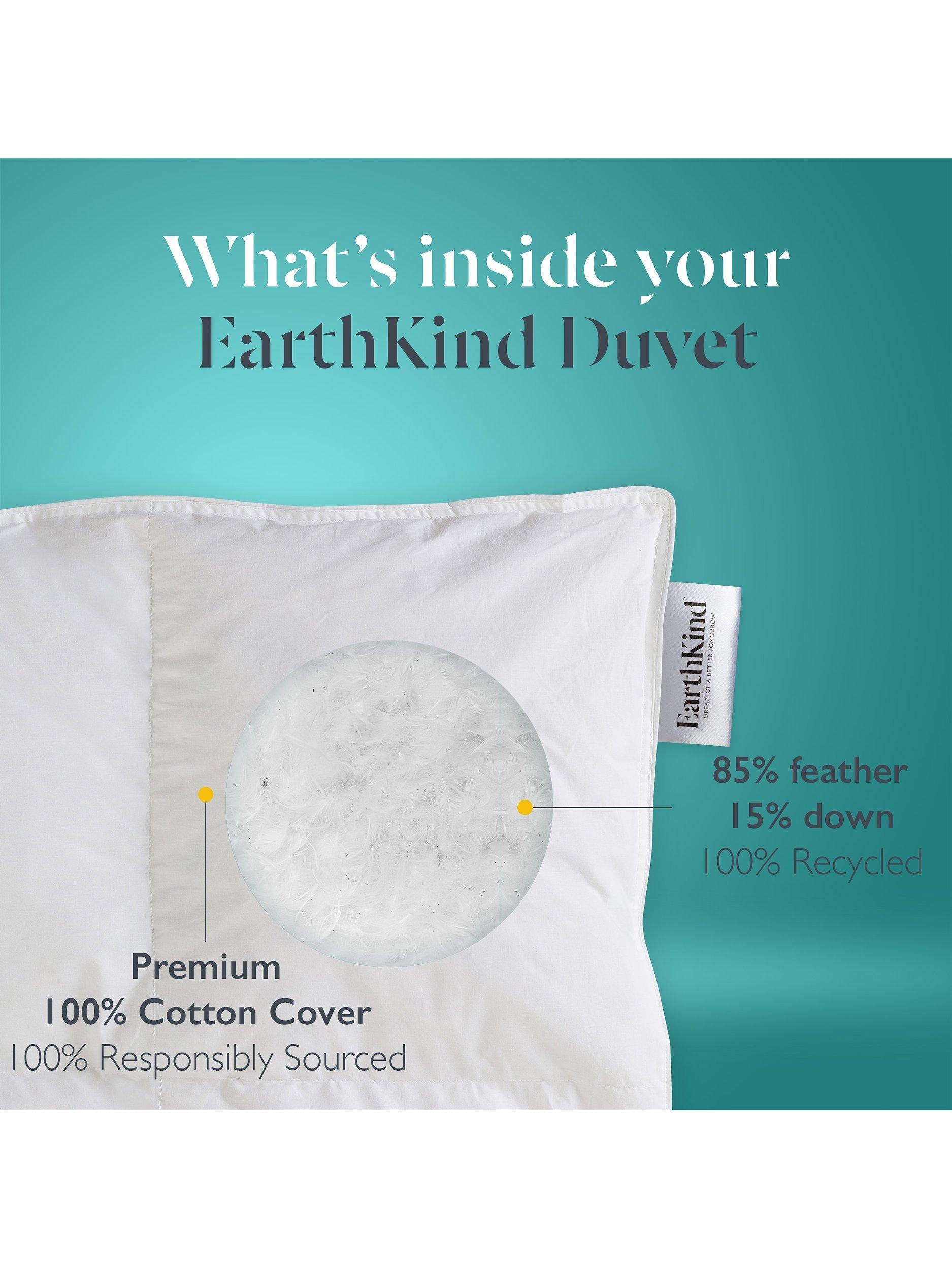 EarthKind collect & recycle feather & down to create all of our their natural duvets & pillows. Natural down & feathers look delicate but they are very durable and keep all of their original warmth and softness once recycled. EarthKind gently clean & sanitize them to make sure they're as good as new before before carefully sorting, blending and hand finishing the duvets with fabrics. All Earthkind duvets and pillows are made in the UK and they don't like packaging waste so there is no plastic and we've designed the bag so you can keep it and use it for something new.