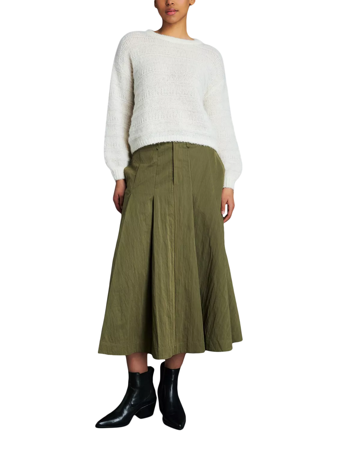 Classic and endlessly flattering, this khaki midi skirt features sharp box pleats, feature pockets, and EAST 42ND’s signature belt loop detailing.