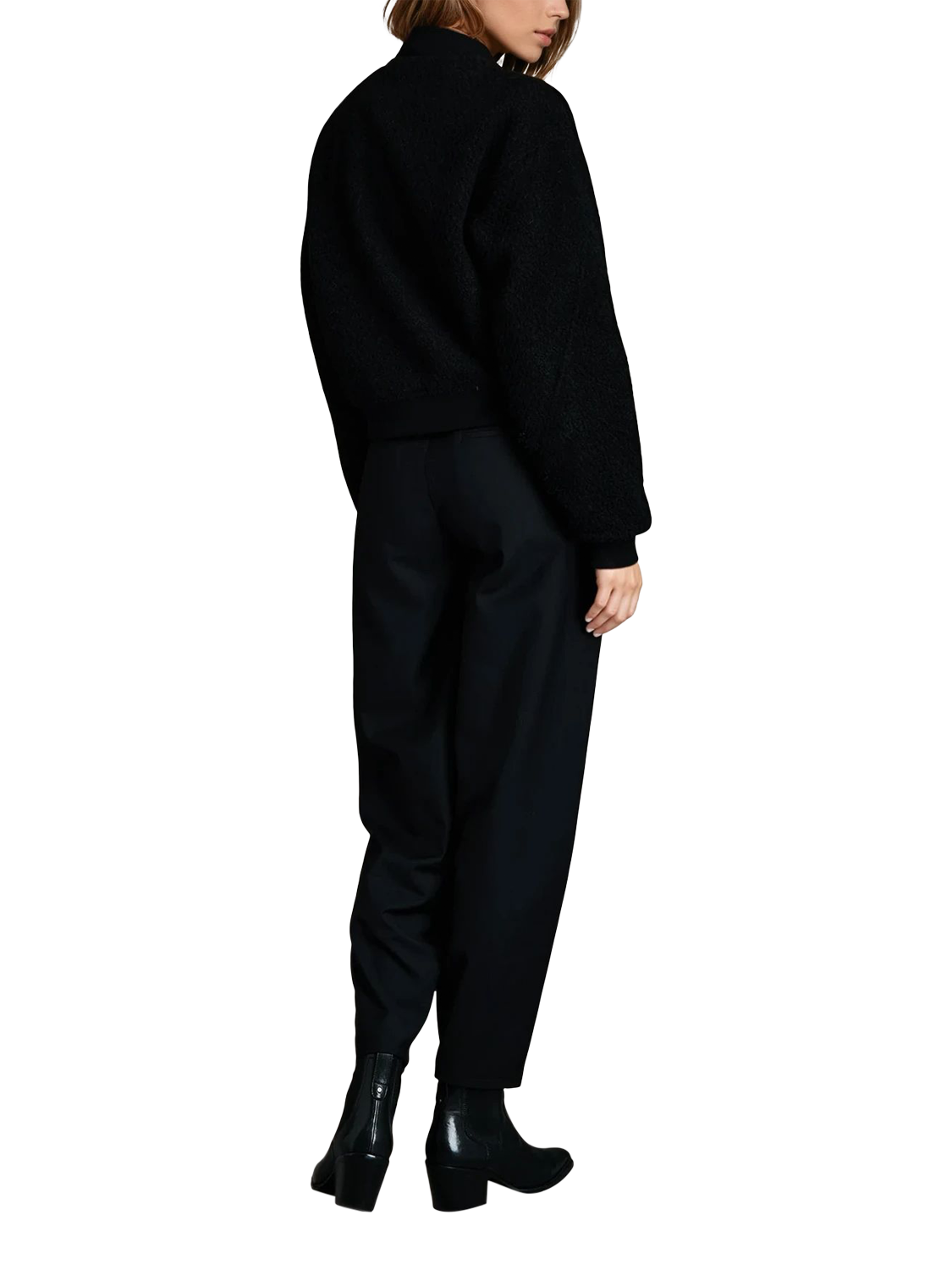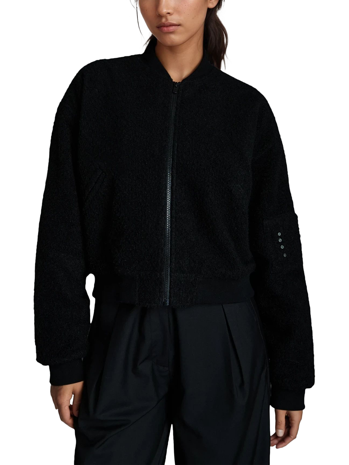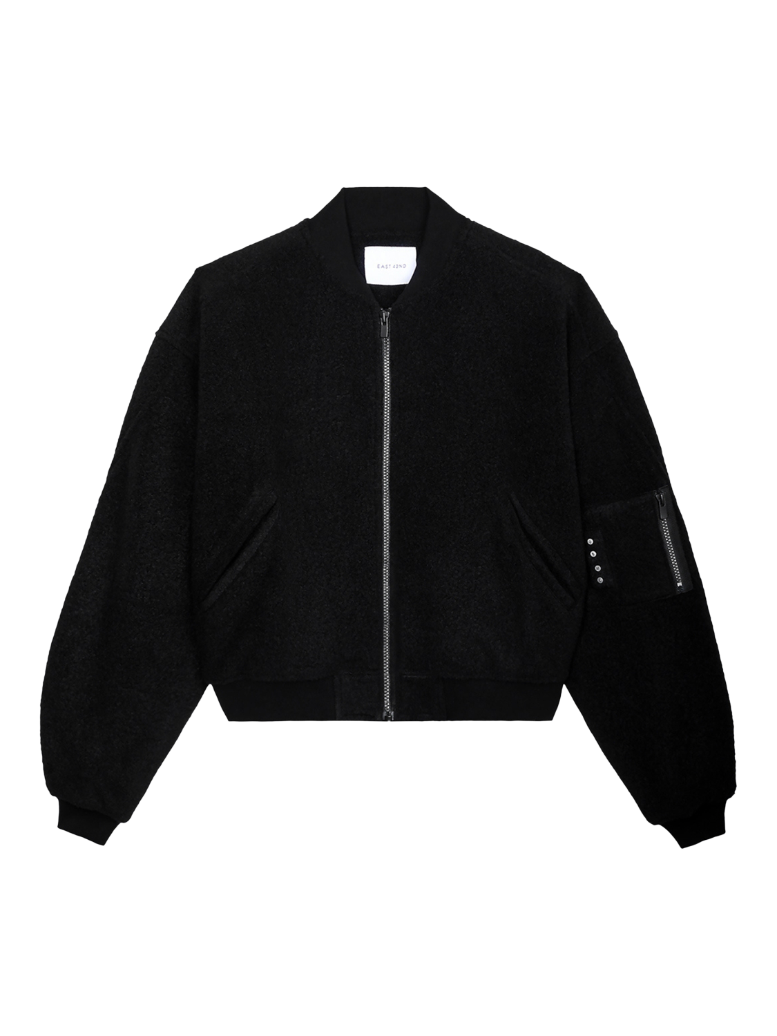 A signature EAST 42ND staple, this black bomber jacket is crafted from durable boucle fabric with a quilted inner for warmth and comfort.