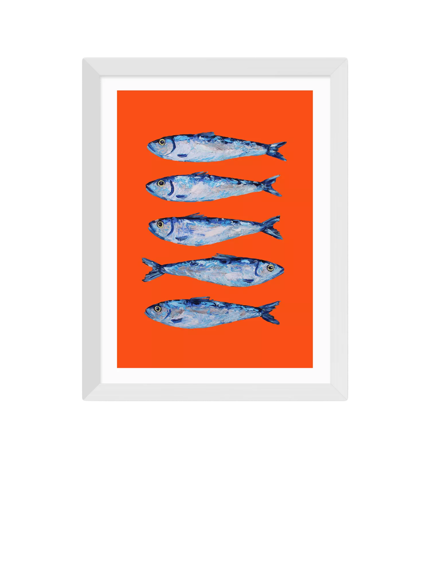 Embrace whimsy with Alice Straker's quirky fish print, showcasing five sardines on a vibrant background. Ideal for bringing a playful touch to your kitchen or dining area.