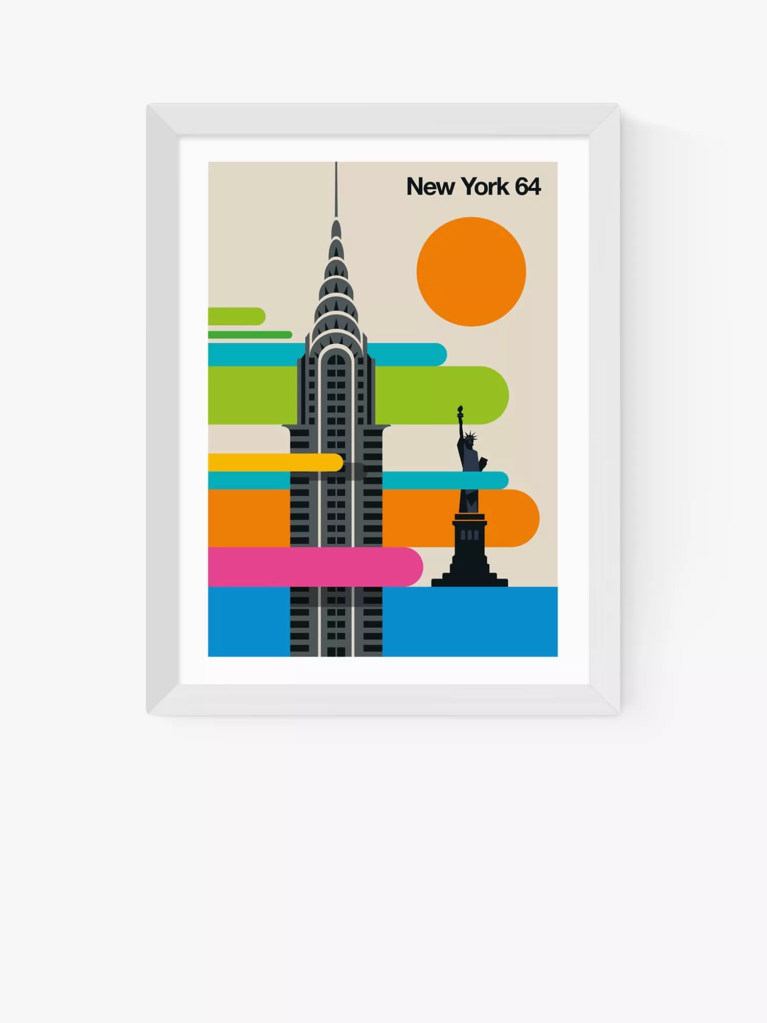 A vibrant retro travel poster with New York landmarks the Chrysler Building and the Statue of Liberty in silhouette, by artist Bo Lundberg.