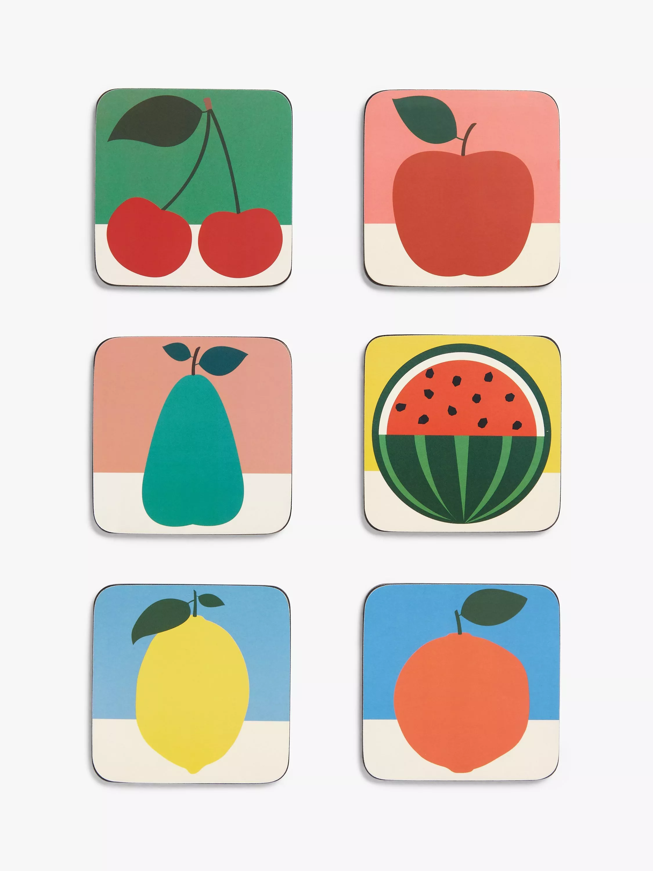 Bold colours and assorted fruit patterns decorate this set of six coasters, designed by Berlin-based artist Rosi Feist for EAST END PRINTS.