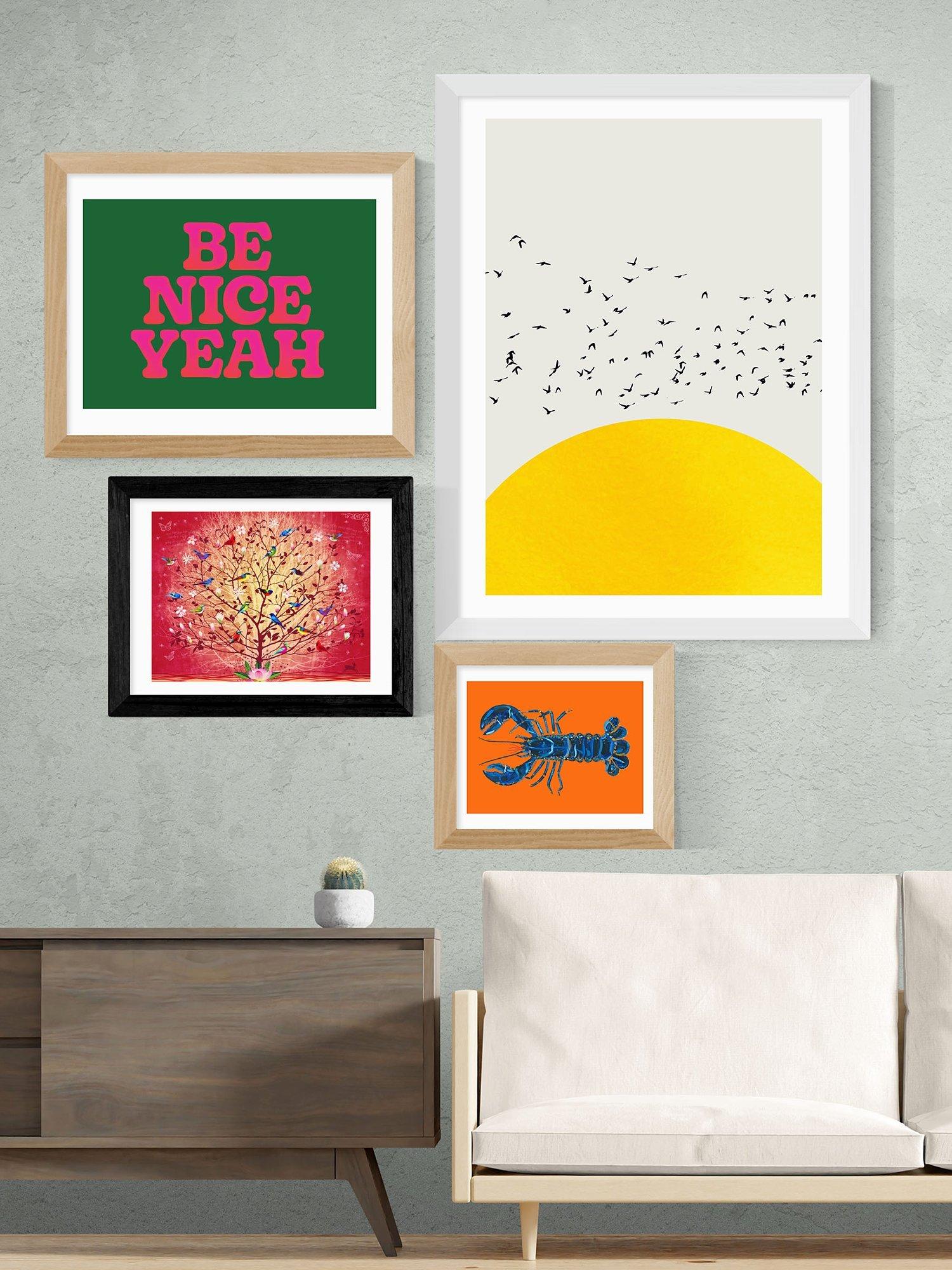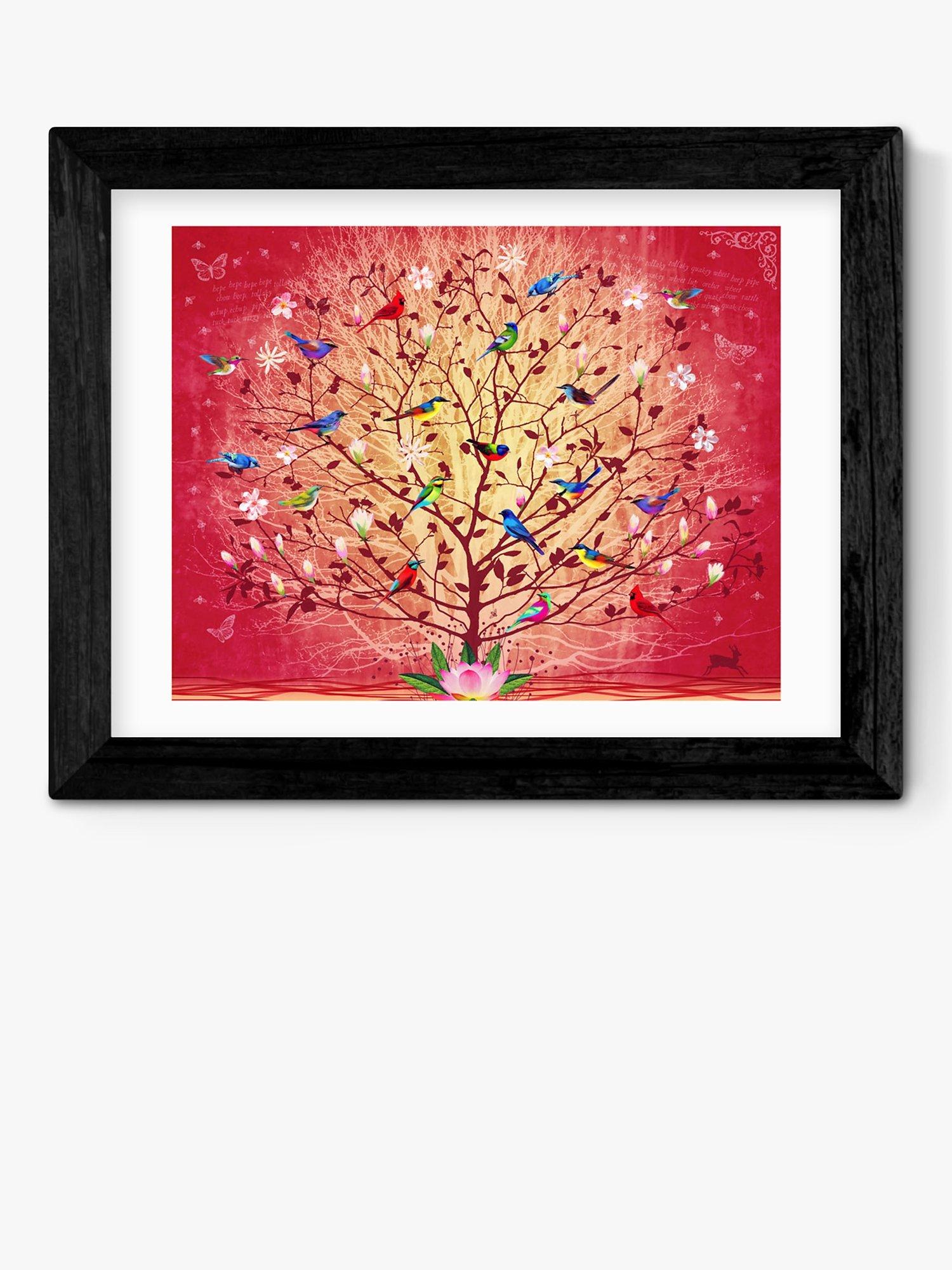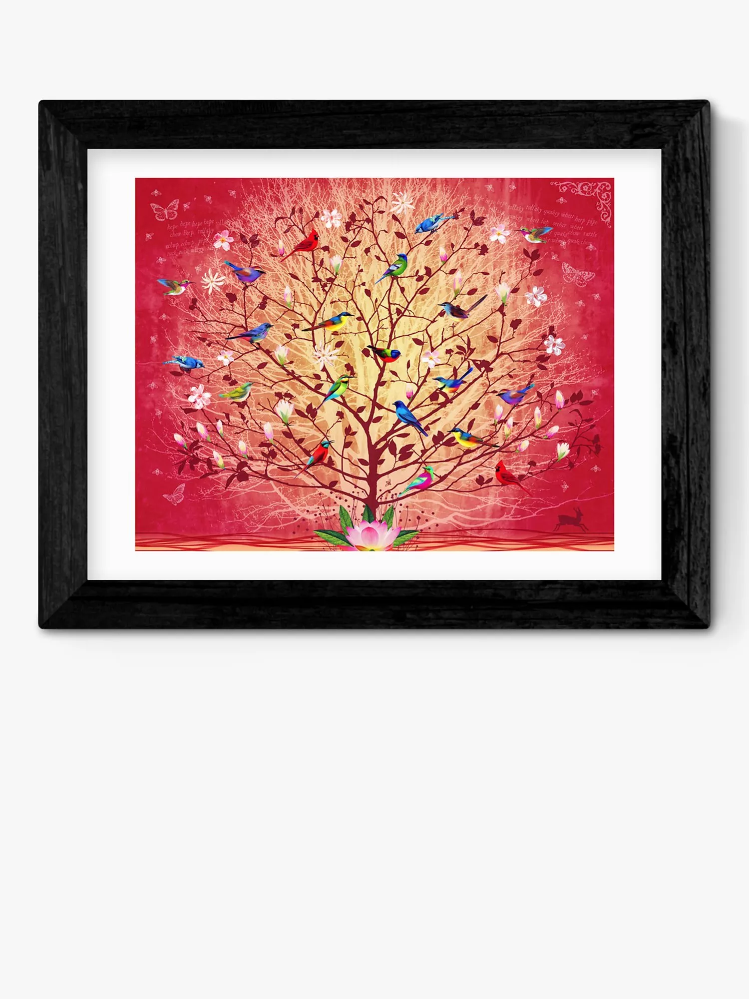 A vibrant print of a tree filled with birds, 'Overlooked Happiness' by Fiona Watson.
