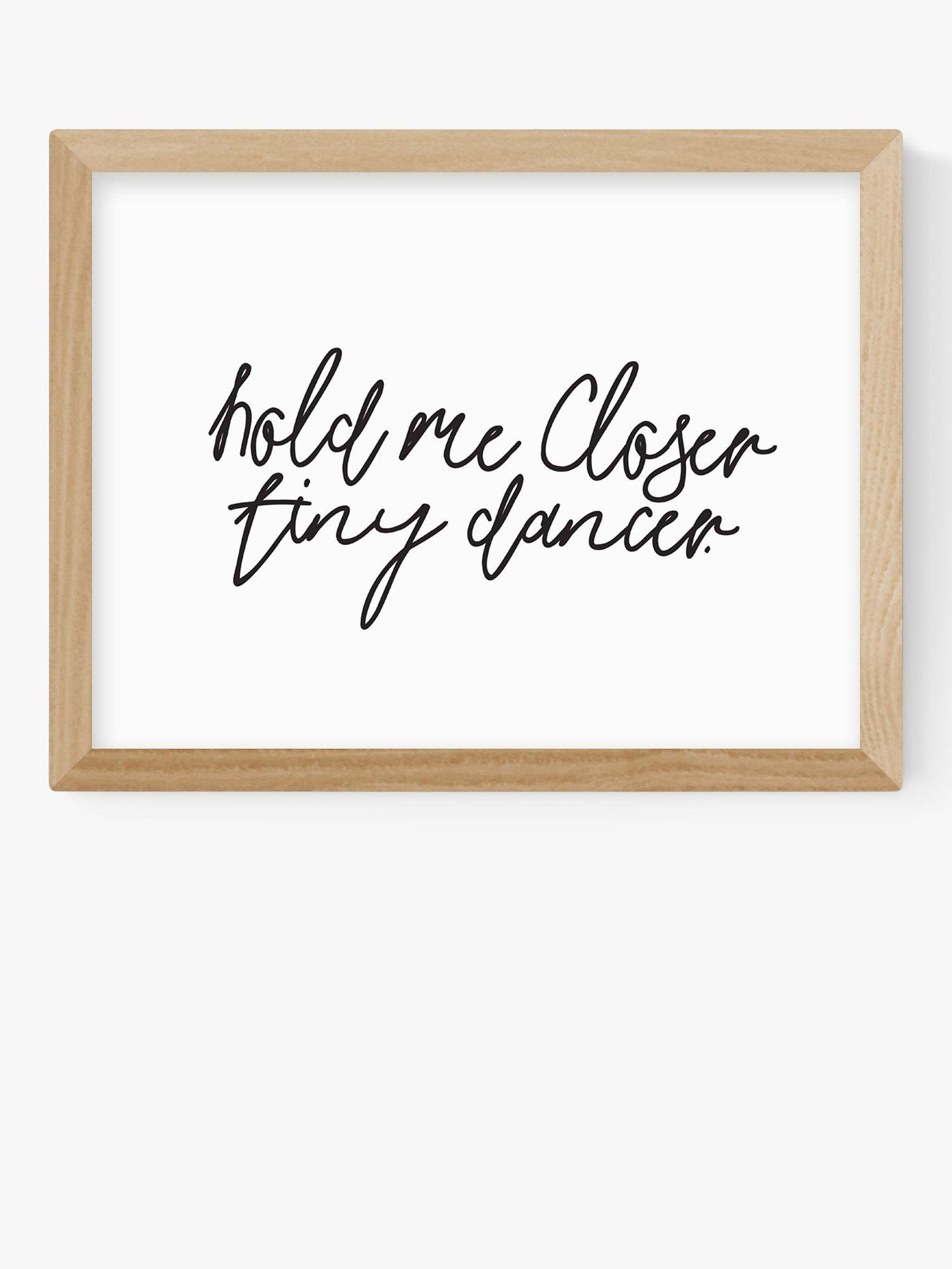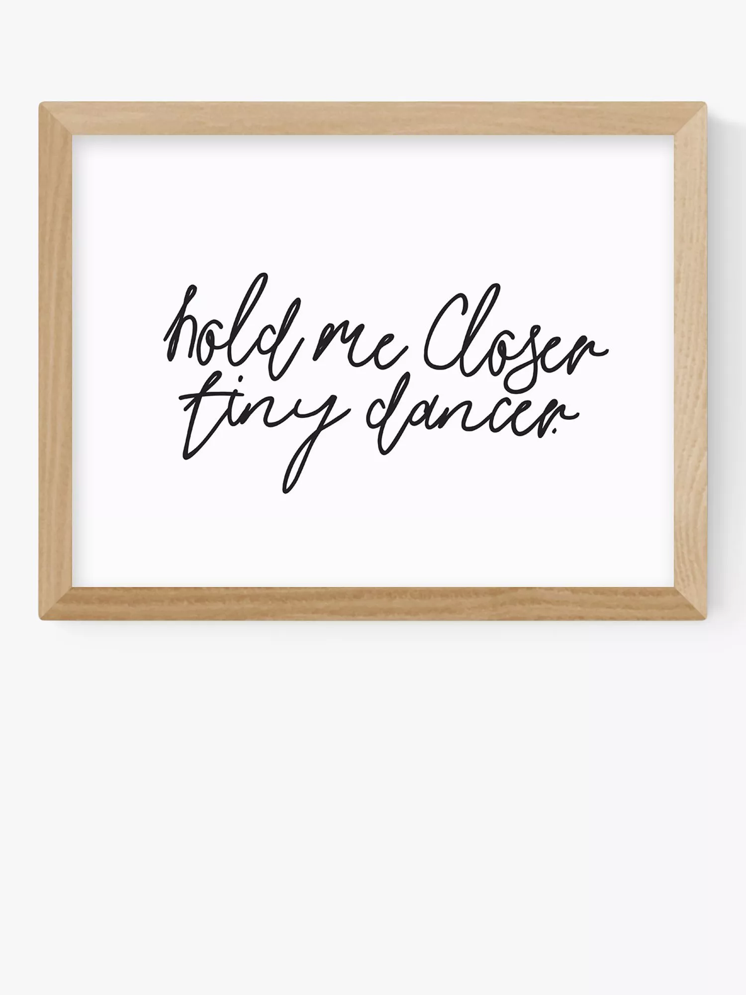A lyrical sentiment, 'Hold me closer tiny dancer', from the Elton John and Bernie Taupin song 'Tiny Dancer'. Designed by Honeymoon Hotel in on-trend monochrome.