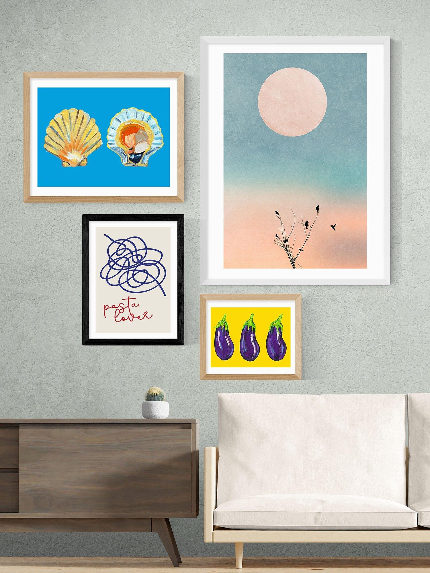 The giclée art printing process and 210gsm acid-free archival paper create an exhibition-quality art print with long-lasting colours that more closely resemble the artist's materials and tones. A digital form of the original work is stored and then printed using a commercial printer and pigment-based inks. The print is presented with an acrylic glaze that's optically the same as glass yet lighter in weight making it easier and safer to hang. Ready to hang on your wall, it's framed in obeche wood in a choice of finishes.