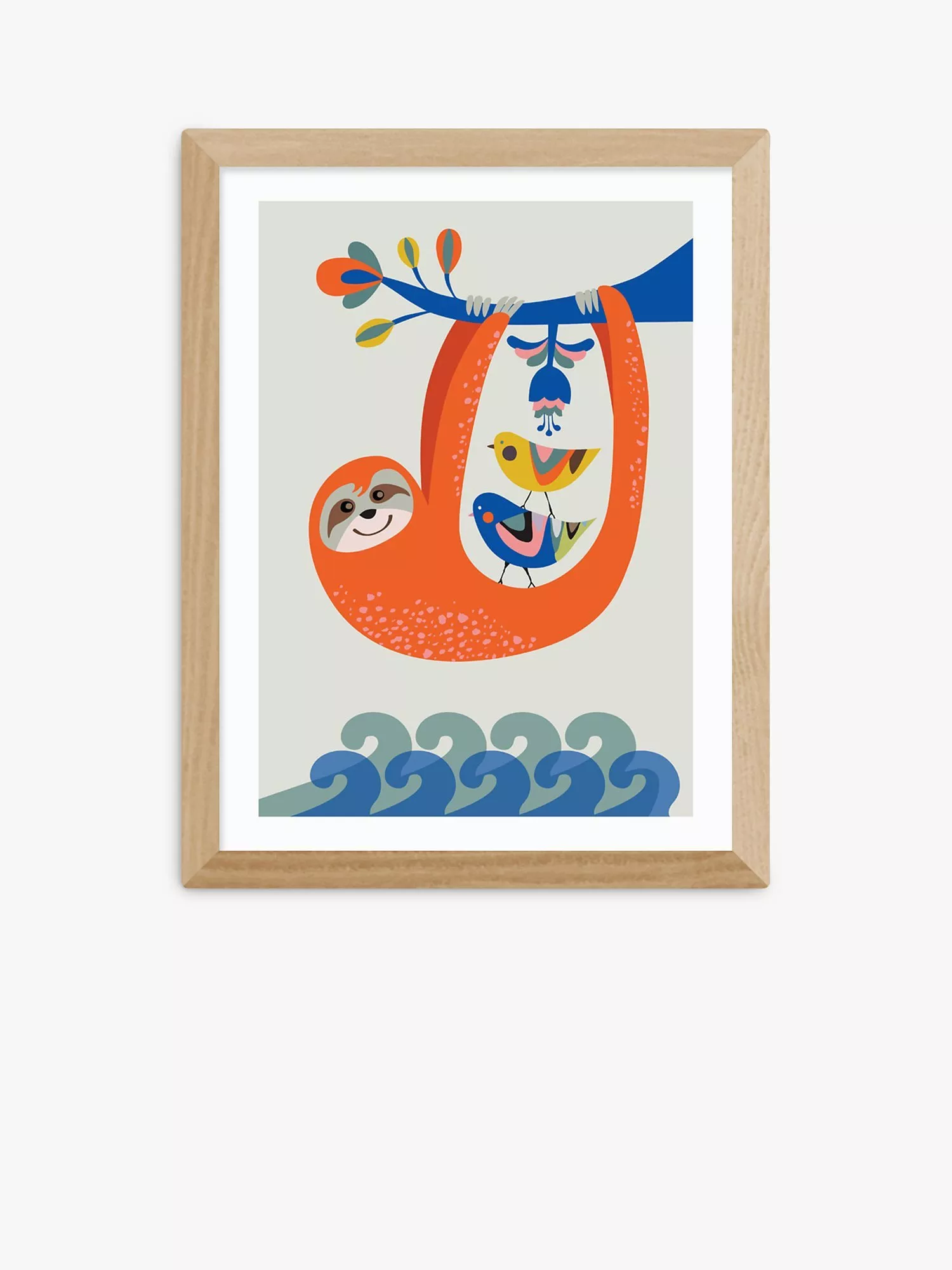 Hang out with this adorable sloth, a colourful framed print by Rachel Lee.