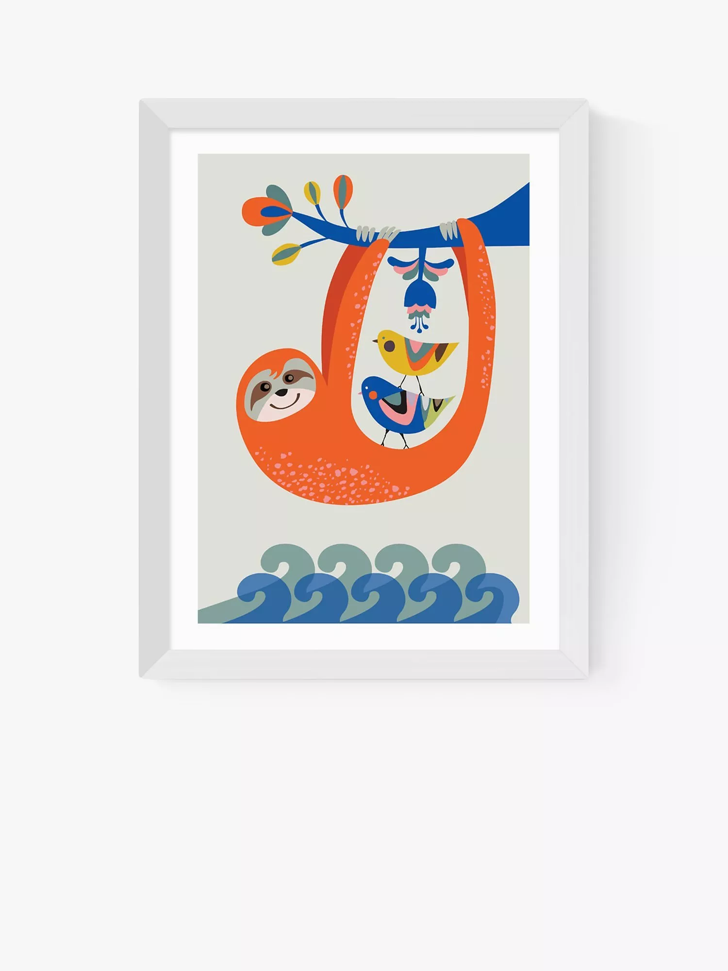 Hang out with this adorable sloth, a colourful framed print by Rachel Lee.