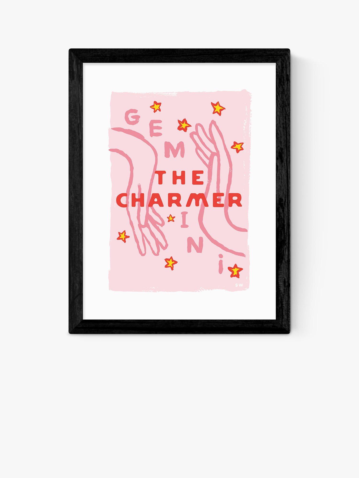 Part of an astrology series by artist Sophie Ward, this print depicts Gemini as The Charmer, in bold colours.