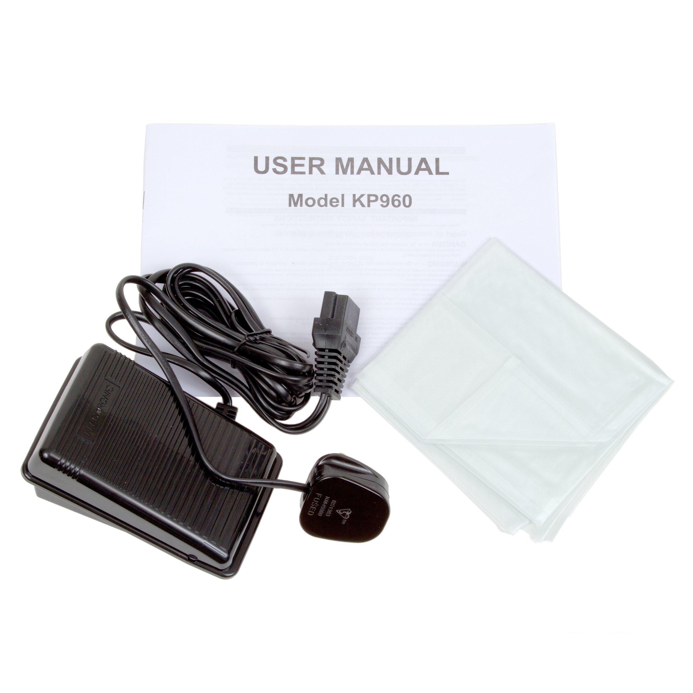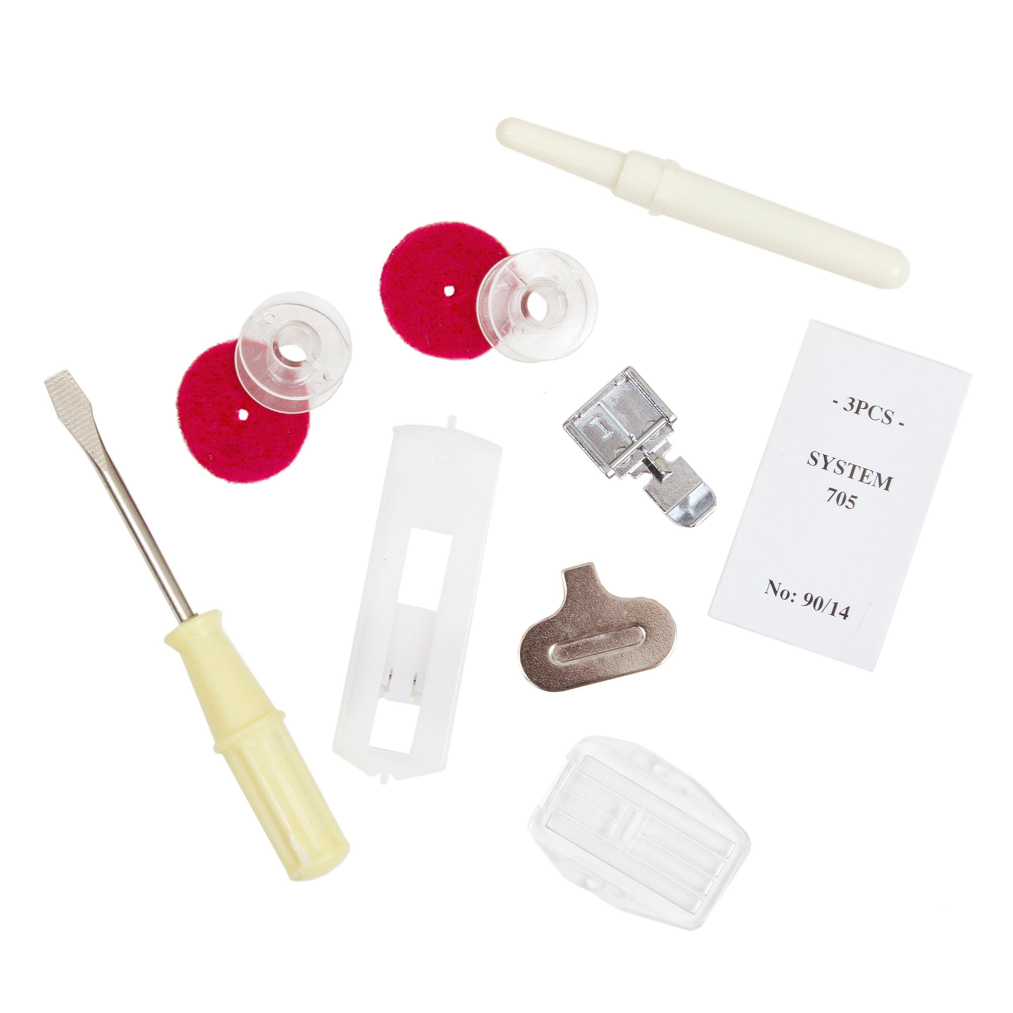 This machine comes with a darning plate, bobbin, screwdriver, needle pack, zipper foot, seam ripper, buttonhole foot, oil and twin needle.